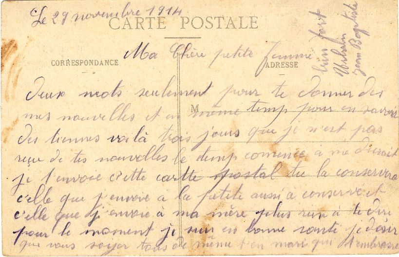 Pendant la guerre il écrit à sa femme Anne et à ses deux enfants Jean et Anne-Marie. (voir correspondance)