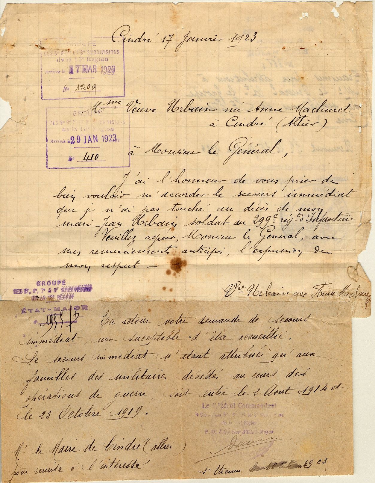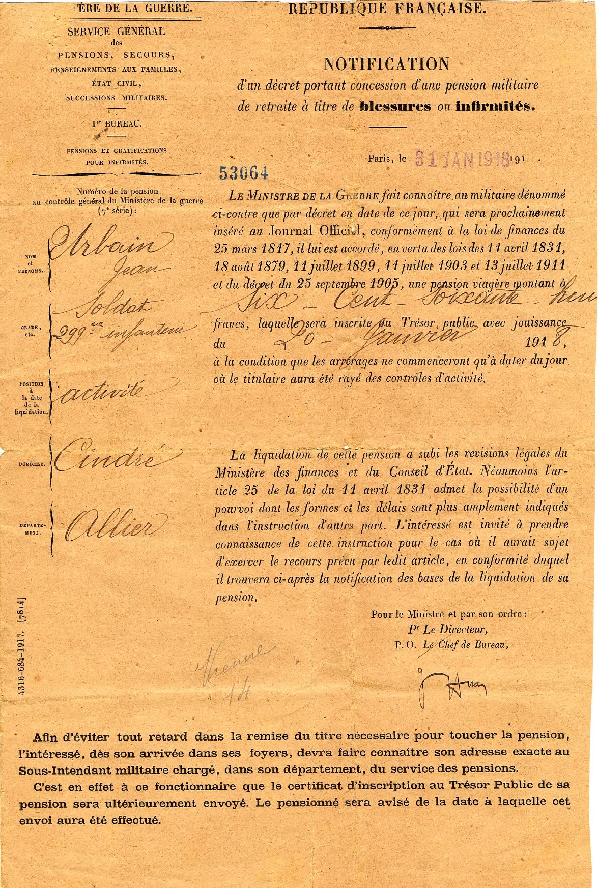 Agé de 29 ans (classe 1905) lors de l’entrée en guerre, Jean- Baptiste Urbain (voir photos), alors cultivateur sur la commune de Cindré, est incorporé au 299e régiment d’infanterie. (voir registre matricule et son livret militaire).