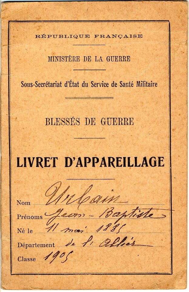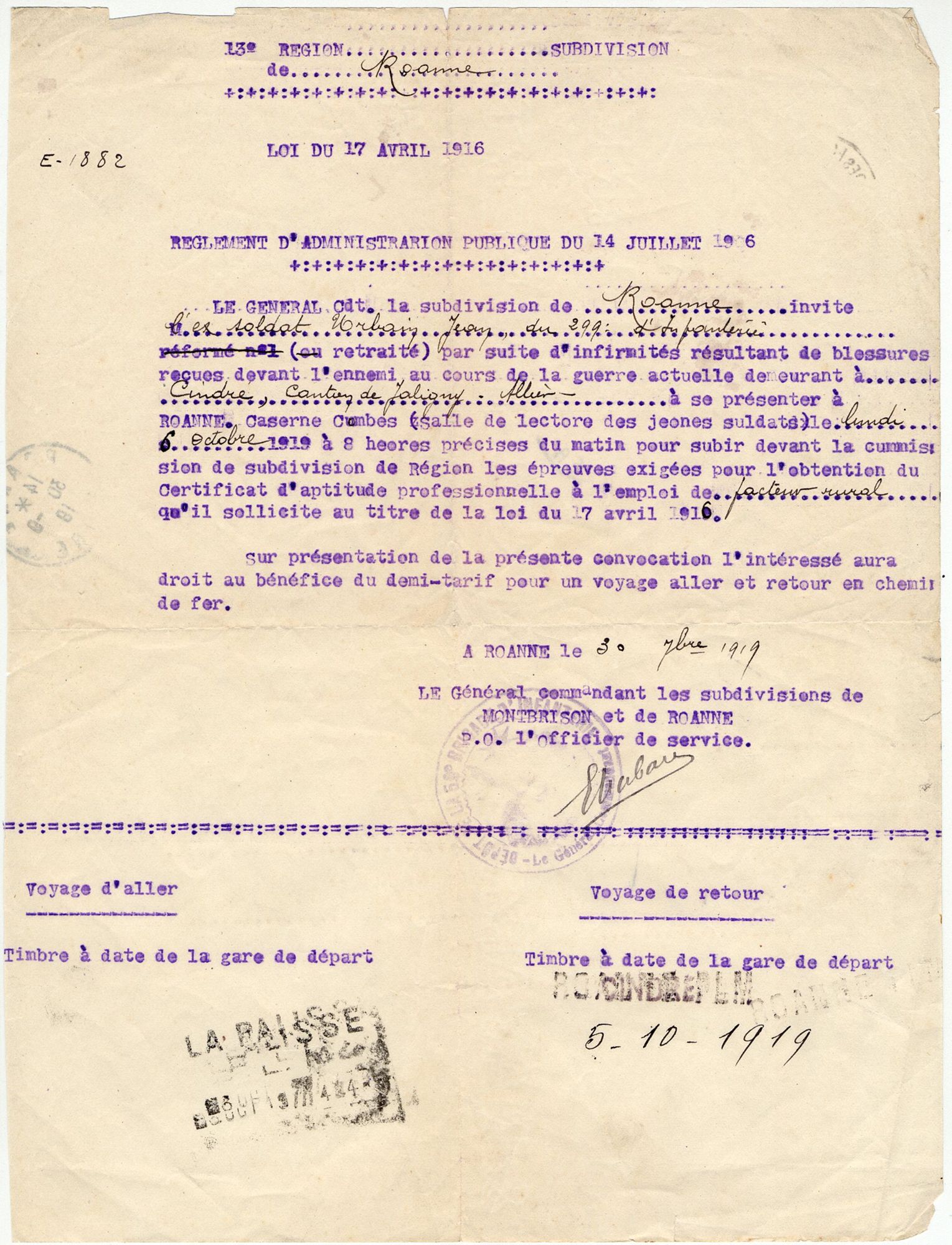 Blessé à l’épaule par des éclats d’obus au fort de Vaux le 24 octobre 1916, il devra porter une épaulière (voir le livret d’appareillage). Admis à la retraite et touchant une pension (voir la pension pour blessure), il devient facteur rural au titre des emplois réservés aux invalides de guerre (voir sa convocation). Il ne survit pas longtemps à la fin de la guerre, la tuberculose l’emporte le 17 mai 1919. Sa veuve, comme beaucoup d’autres, a bien du mal à faire reconnaître la mort de son mari comme consécutive de ses blessures de guerre (voir courriers).