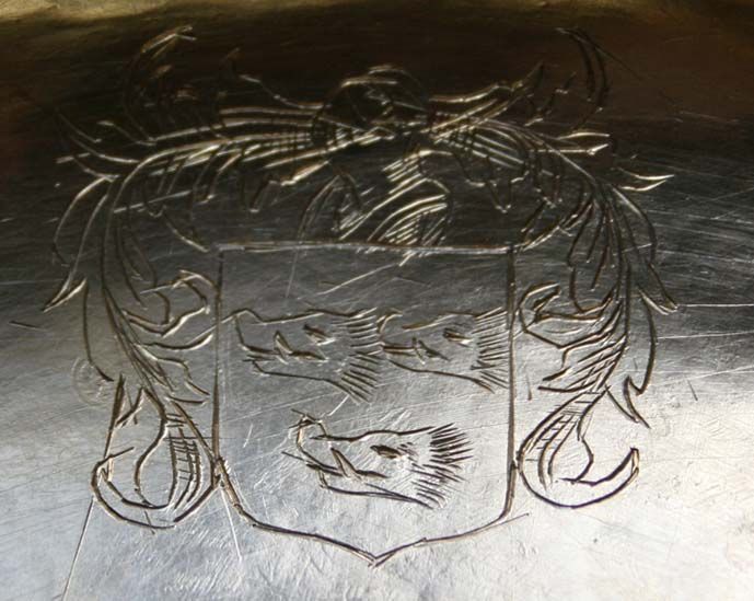 Armoiries : d'azur au chevron d'or accompagné de trois têtes de dauphins de même - Casque : feuilles d'acanthes en lambrequins - Cimier : tête de dauphin - Devise : Ad Insignia Gentilicia Gentis Auberiae.
