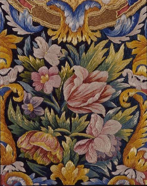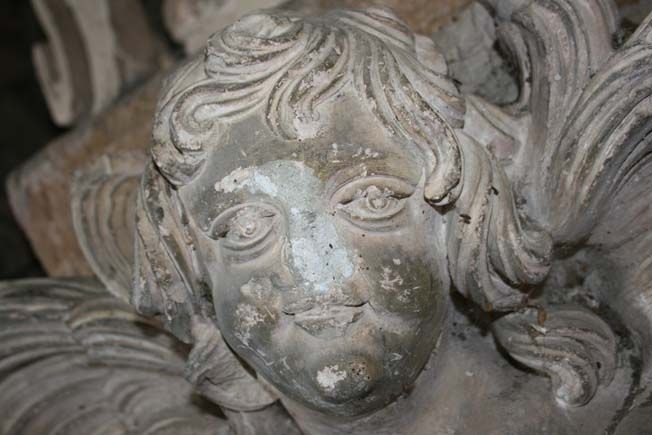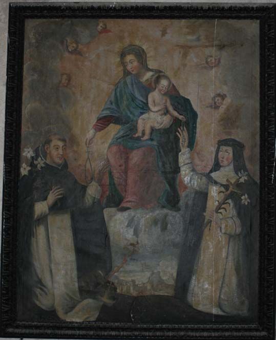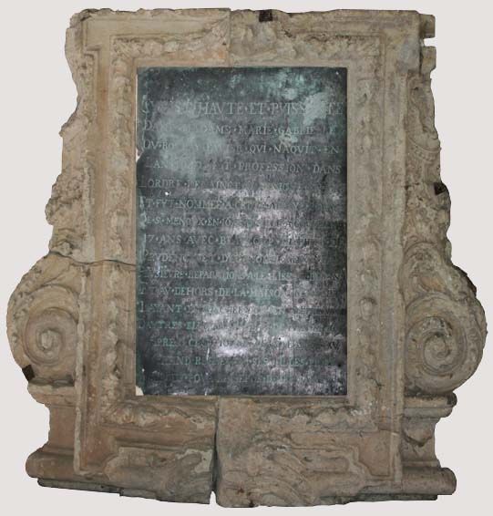 Marie-Gabrielle du Boulay-Favier (1678-1695) semble issue d’une famille picarde anoblie. Ses armes sont : « d’azur, à 3 concombres d’argent, les queues en haut [1]». Rarement intactes, elles se retrouvent un peu partout sur les ouvrages d’art commandés par l’abbesse. Sur la pierre, les fameux concombres ont été grattés par les révolutionnaires [2]. Dans les tableaux, le blason entier a été découpé [3]. Seuls ceux situés sur l’autel présumé de Lorette, à la croisée du transept et sur une plaque de fondation de 1687 ont échappé à leur perspicacité. Cette abbesse était dominicaine. C’est pourquoi elle fit placer sur le grand autel la torche enflammée, emblème dominicain, et commanda un tableau représentant Saint Dominique et sainte Catherine de Sienne recevant le rosaire, où se retrouve ce même emblème tenu par un petit chien.
