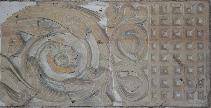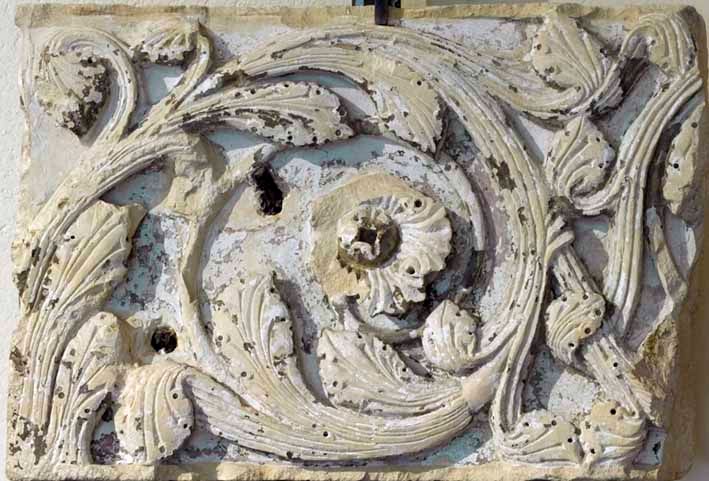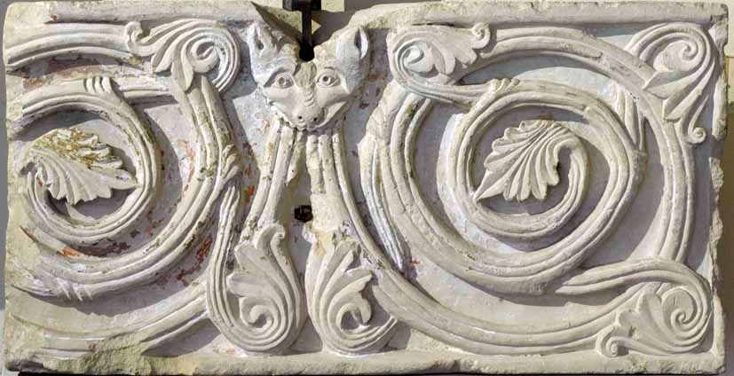Toute reconstitution plus précise de cet ensemble est difficile : il ne reste rien de l’autel, non plus que de la clôture du sanctuaire. Certaines des plaques de rinceaux rectangulaires en surnombre proviennent peut-être des degrés de l’autel [2]. Une grande plaque, figurant deux anges dans les nuées, devait se trouver dans les parties hautes de ces aménagements liturgiques [3]. Il pourrait s’agir, par exemple, des vestiges d’un baldaquin de pierre surplombant la châsse.