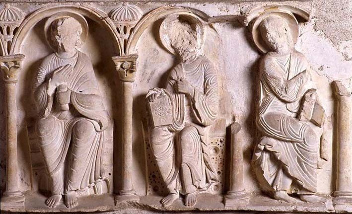Sur les côtés de la châsse, selon l’usage du temps [4], en lieu et place des vingt-quatre vieillards de l’Apocalypse figurent les douze apôtres assis sur des trônes sous des arcades symbolisant l’Eglise. Représentés dans des attitudes légèrement variées, ils siègent de manière digne et tiennent alternativement un livre ou un volumen (livre en rouleau), tandis que, de leur main libre, ils font un geste d’acclamation ou d’écoute. Seuls saint Paul [5], et très probablement saint Pierre, étaient mis en valeur par leurs attributs spécifiques (l’épée et la clef), et encadraient le Christ. La place de choix assignée à ces deux apôtres romains pourrait être une nouvelle allusion à Rome et témoigner de l’attachement de l’abbaye à la papauté. Vêtus de couleurs vives (azur, rouge) et portant des auréoles ocre jaune, les douze apôtres se détachaient autrefois sur un fond bleu, entre des colonnes aux chapiteaux et aux bases rouges.