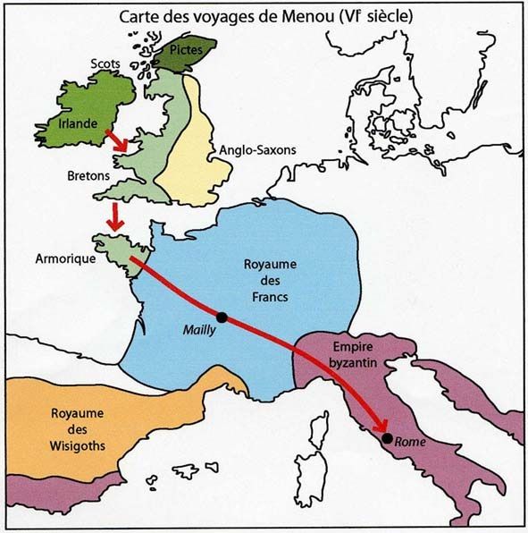 Né en Irlande 1, Menou traverse la Manche depuis la Grande-Bretagne jusqu’en Armorique, probablement sous le règne de Childebert (511-558). Il suit en cela le trajet de nombreux prêtres, moines ou laïcs bretons et irlandais qui émigrent de la Grande-Bretagne (Pays de Galles, Devon, Cornwall) ou de l’Irlande vers le continent, aux Ve, VIe et VIIe siècles. En Armorique, Menou pourrait avoir rencontré saint Corentin, évêque ou abbé-évêque de la cité des Osismes, qui l’aurait consacré prêtre. A la mort de Corentin, Menou aurait été choisi par le peuple pour lui succéder.
