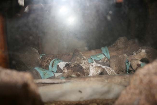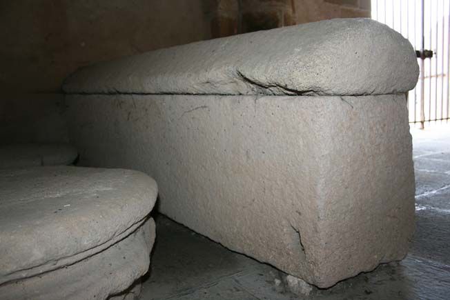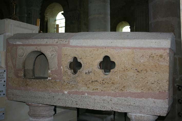 Dans le narthex 3 de l’église est conservé un autre sarcophage aménagé pour le culte qui pourrait fort logiquement être celui de saint Blaise, disciple de saint Menou et deuxième patron de la paroisse. Ce sarcophage du haut Moyen Age, que l’on peut dater sensiblement de la même époque que celui de saint Menou, est également pourvu d’une fenestella, ainsi que d’un second trou plus petit, trou d’écoulement qui servait à recueillir les liquides (huile ou eau) sanctifiés par leur passage dans le sarcophage. Ces liquides étaient ensuite emportés comme reliques par les pèlerins.