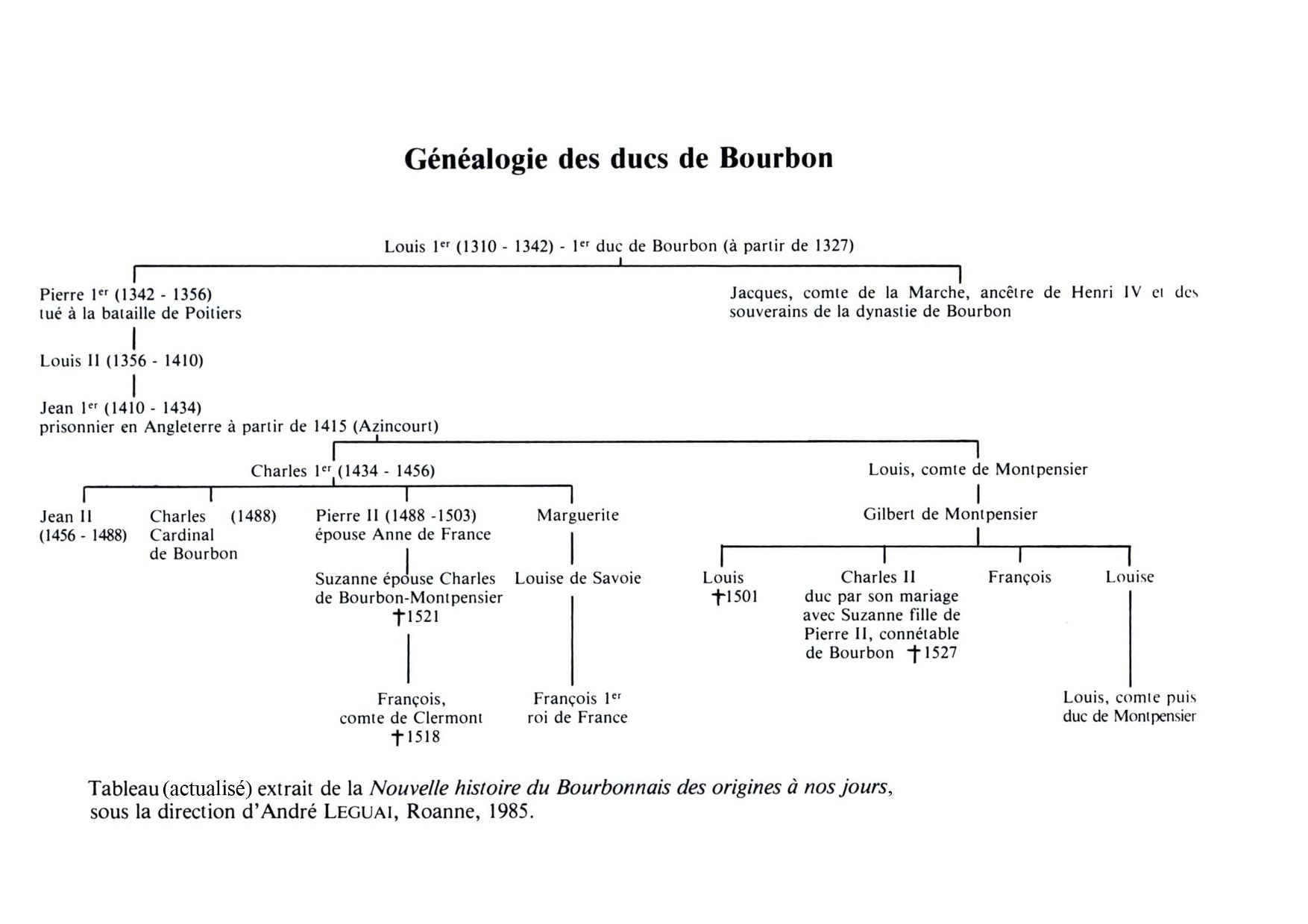 Jean 1er succède à Louis II en 1410. Le pays va bientôt connaître l’une des périodes les plus sombres de la guerre de Cent Ans avec la défaite d’Azincourt en 1415 et toutes ses conséquences. Jean 1er participe d’ailleurs à la bataille et il y est fait prisonnier : il meurt en captivité en Angleterre en 1434. Dans l’intervalle, le rattachement de l’Auvergne est devenu réalité. Charles 1er (1434-1456) succède à son père. Par son mariage avec Agnès de Bourgogne, sœur du duc Philippe le Bon, il œuvre au rapprochement entre les Armagnac-Orléans et les Anglo-Bourguignons. Il est d’ailleurs l’un des négociateurs, en 1435, du traité d’Arras qui scelle la paix pour un temps entre la royauté et la maison de Bourgogne. En 1440, toutefois, Charles 1er devient l’un des chefs, avec le dauphin Louis, de la révolte de la Praguerie dirigée contre Charles VII ; le roi attaque alors ses Etats et le force à signer la paix à Cusset. A Charles 1er succède son fils Jean II (1456-1488) qui participe en 1465 à la guerre du Bien public avec le comte de Charolais – le future Charles le Téméraire – et le duc de Berry ; Louis XI réplique à l’attaque en occupant Montluçon et Saint-Pourçain. Jean II meurt en 1488 sans enfant, après avoir été fait connétable de France. Son frère cadet, le cardinal archevêque de Lyon Charles de Bourbon, renonce très vite au duché, abandonnant ses droits au troisième frère, Pierre de Beaujeu.