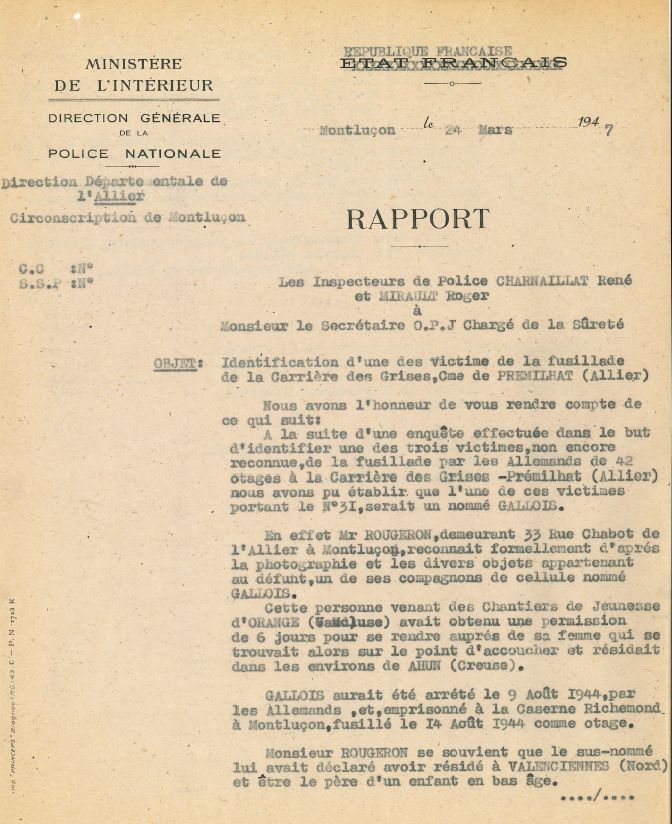 Le 14 août à l'aube, non loin de la carrière des Grises à Prémilhat, un habitant est réveillé par des cris et des coups de feu. Il prévient les autorités qui se rendent sur place et découvrent alors, dans une fosse commune de sept mètres de long, les corps de 42 hommes provenant de la caserne Richemont où ils étaient prisonniers. Ces hommes avaient été emportés par les Allemands en camion, sans explication.