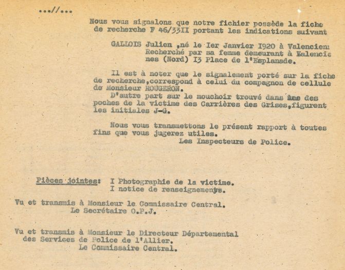Ce n'est qu'en 2019 que l'identité de l'un des trois inconnus est révélée au public par un membre de sa famille originaire de Valenciennes : il s'agit de Julien Gallois pourtant identifié dès 1947 mais dont le nom était resté dans les archives de la Police sans avoir été porté à la connaissance des historiens.
