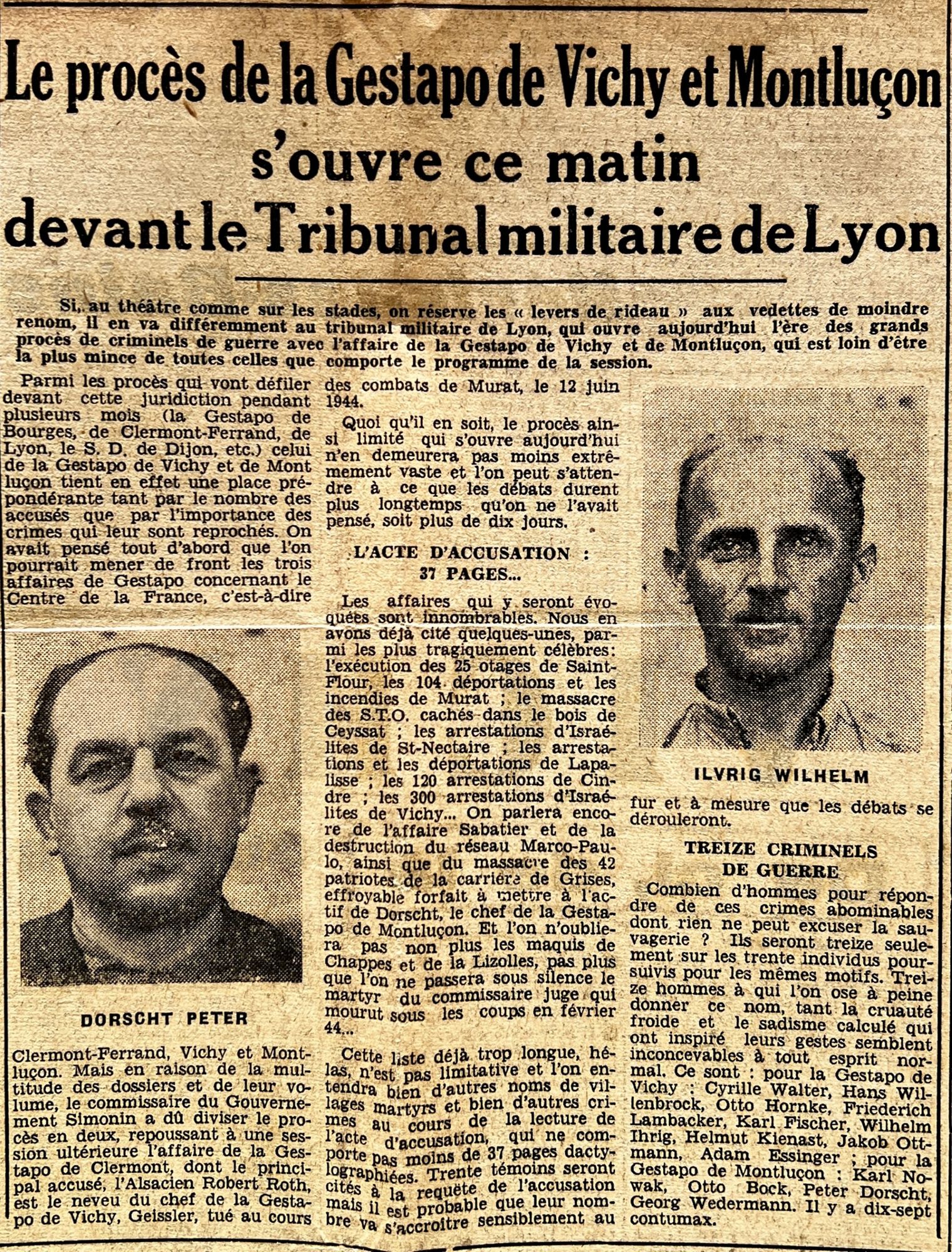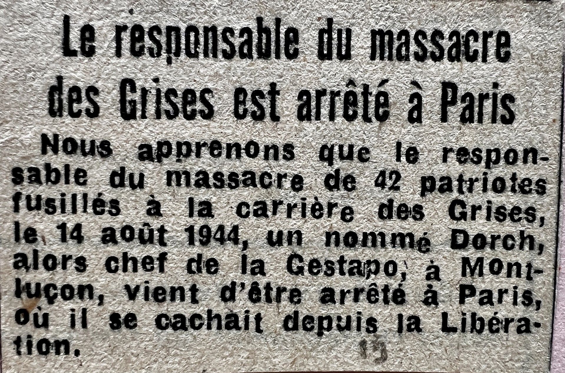Il faut attendre 1949 pour que Peter Dorscht, chef de la gestapo de Montluçon, soit enfin découvert et arrêté à Paris où il se cachait depuis la Libération. Le procès de la Gestapo de Vichy et Montluçon qui s’ensuit à Lyon et à Marseille aboutit en 1951 à la condamnation à mort de sept des responsables, dont Dorscht. La responsabilité du massacre de la carrière des Grises lui est attribuée.