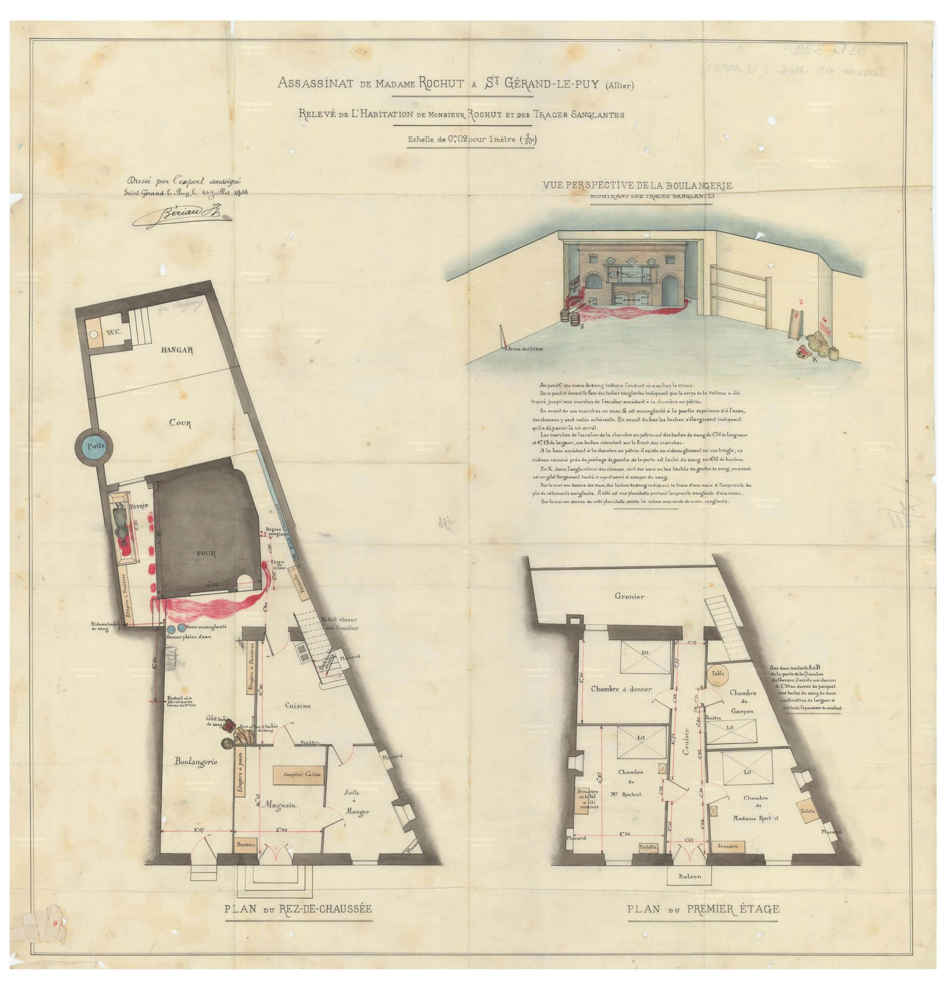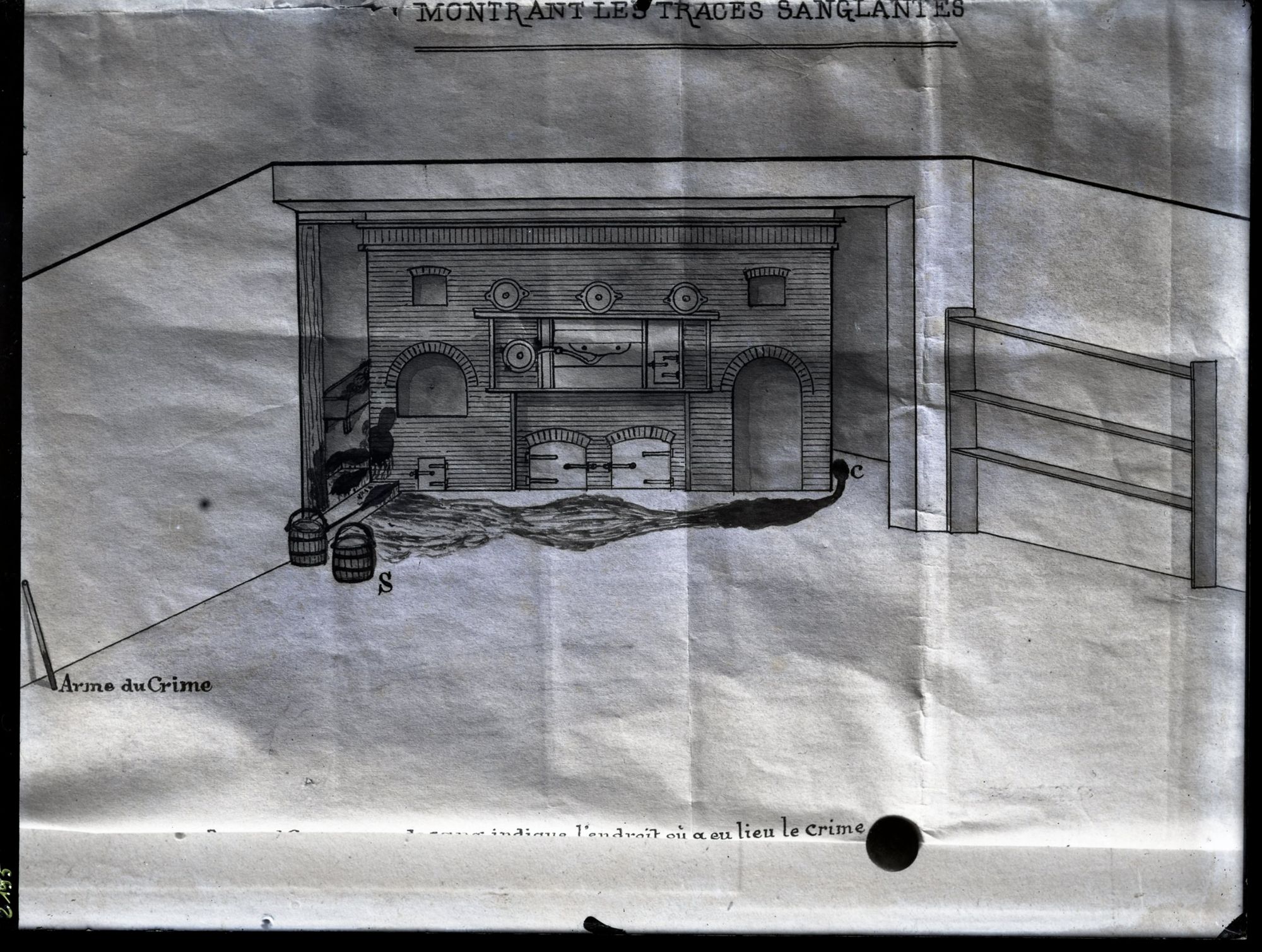 Relatant ce fait divers à la directrice adjointe des archives départementales, Mme Poupin, elle me fit part des recherches d’une étudiante en architecture dont le mémoire traitait du lien entre architecture et investigation criminelle. Quelques mails plus tard, nous pûmes échanger nos travaux respectifs sur ce crime : les plaques de verre numérisées pour ma part et le document original (ci-dessous) de son côté.