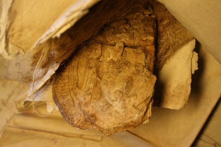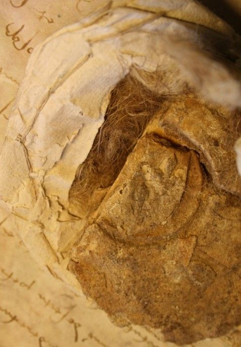 Attache : Simple queue de parchemin. Pochette de papier cousue et tapissée de crin ou de filasse.