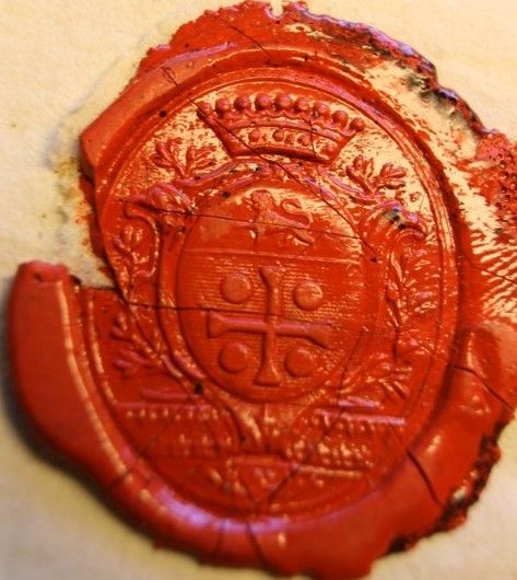 Description : Armoiries : d'azur à la croix pattée (d'argent ?) cantonnée de 4 tourteaux (du même ?), au chef d'argent chargé d'un lion passant (de gueules ?). Ornements : couronne, cuirs, feuillages.