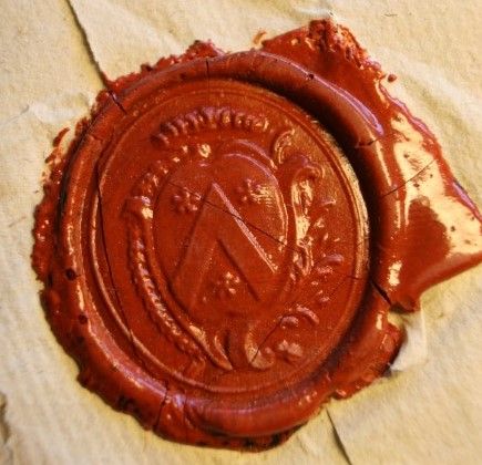 Description : Armoiries : d'azur au chevron d'or (?) accompagné de trois roses de [...].