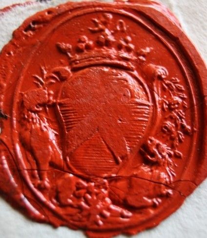 Description : Armoiries : d'azur, au chevron d'or, au chef de même, chargé d'un lion léopardé de gueules. Ornements : lions tenants d'armes, croix de l'ordre du Saint-Esprit, couronne surmontée par un lion rampant.