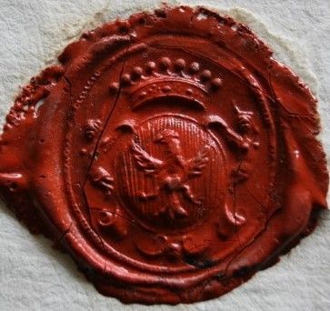 Description : Armoiries : de gueules à l'aigle éployée. Ornements : couronne, cuirs.
