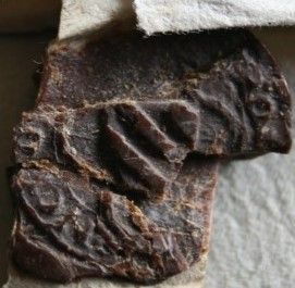Description : Armoiries : bandé de ? et de ? de six pièces. Ecu dans une quintefeuille entourée d'une inscription disparue.