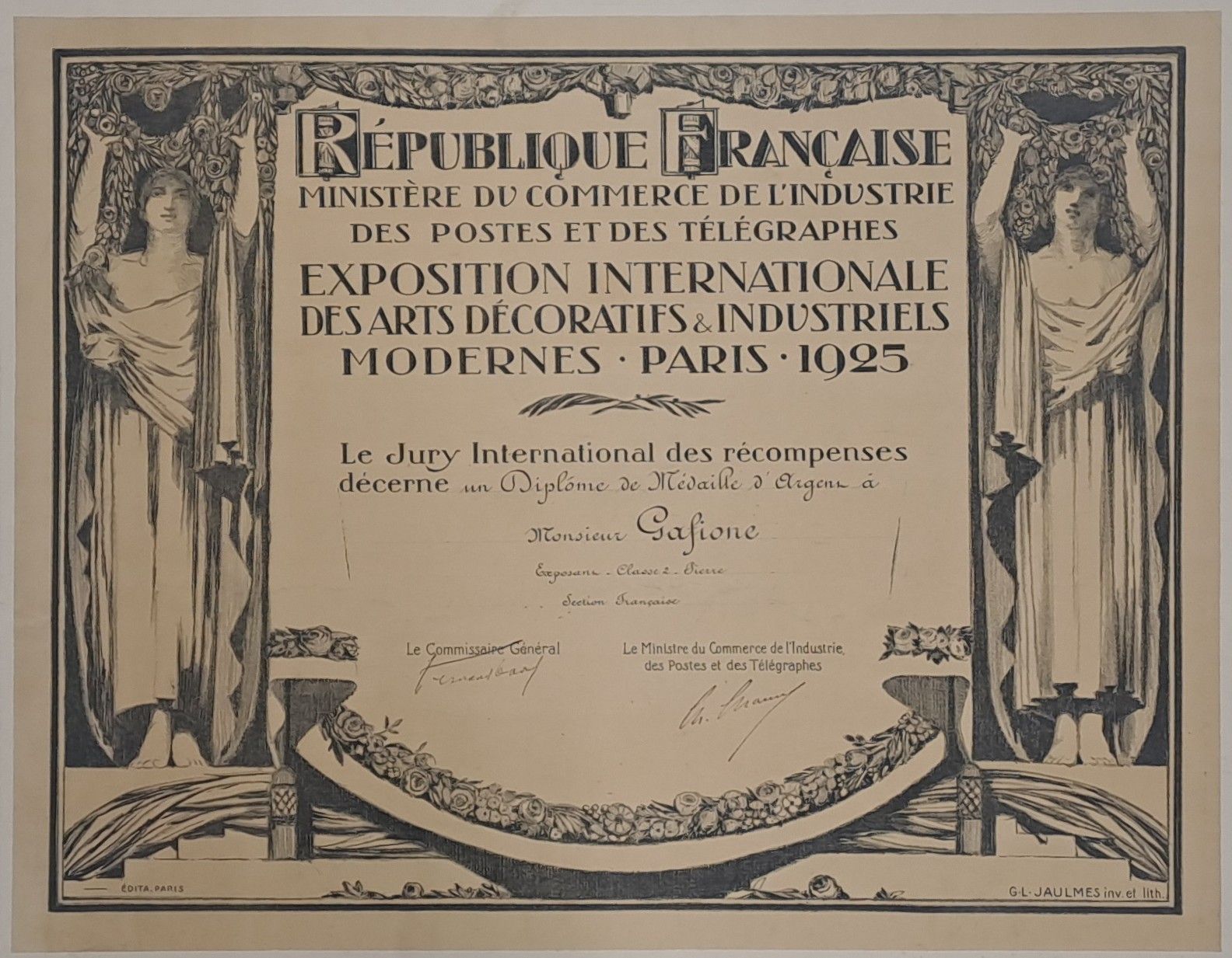 Agé d'une cinquantaine d'années en 1925, Galfione est un décorateur reconnu à Moulins, dans l'Allier et les départements voisins. Il participe à L'Exposition internationale des Arts décoratifs et industriels modernes. Elle se déroule à Paris sur l'esplanade des Invalides et aux abords du Petit et du Grand Palais, d'avril à novembre 1925. Plus de 16 millions de visiteurs sont venus admirer les créations internationales, françaises, mais aussi provinciales... Ainsi Galfione décroche une médaille d'argent.