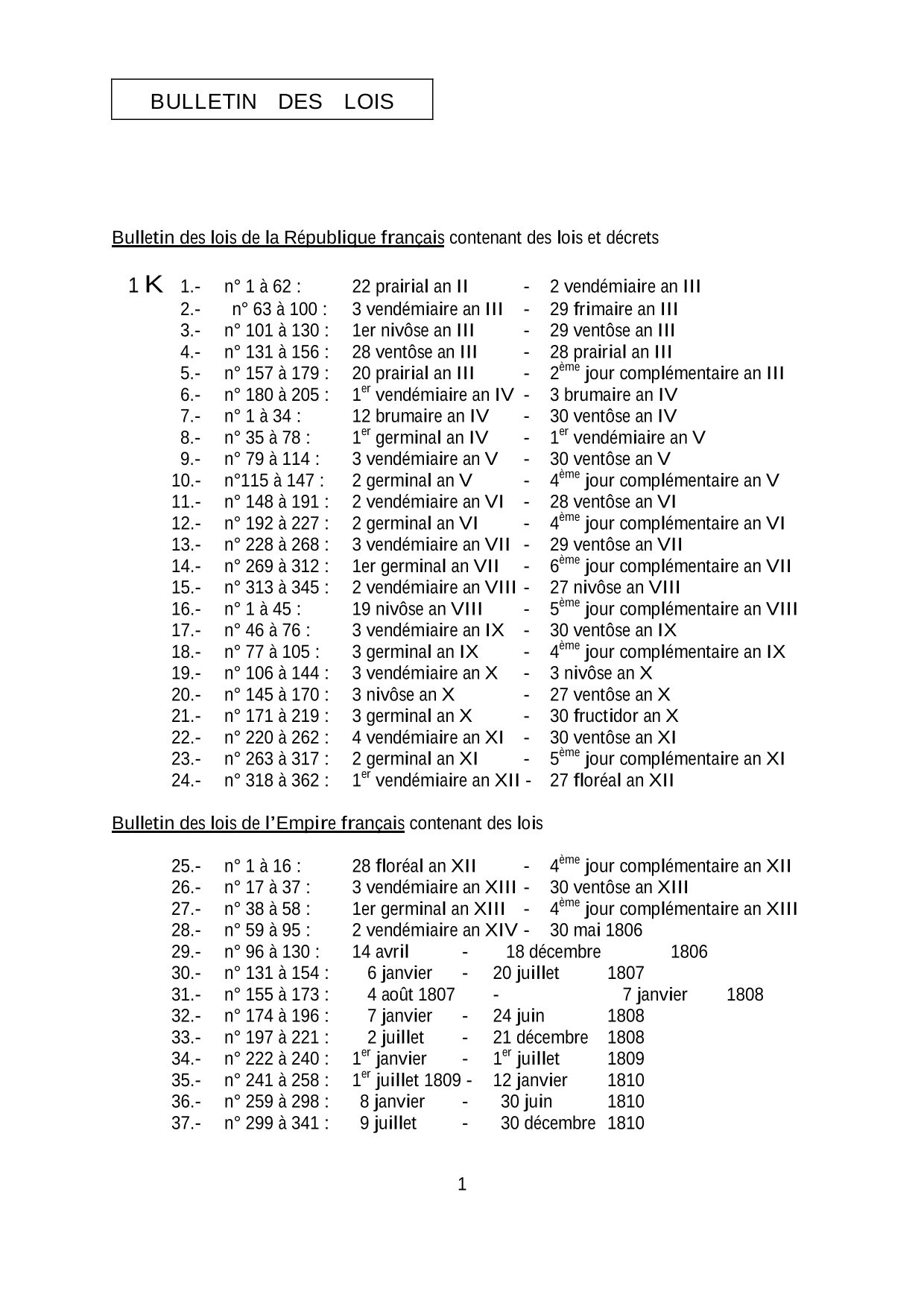 Inventaire de la sous-série 1 K : Bulletin des lois, an II-1970.