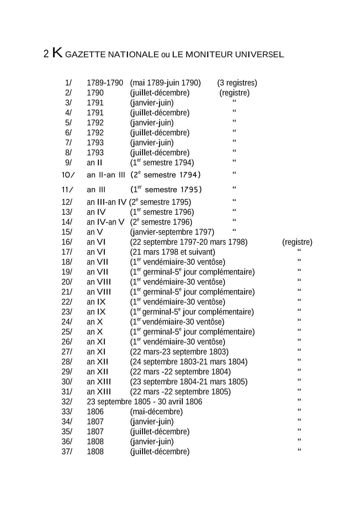 Inventaire de la sous-série 2 K : Le Moniteur universel (1790-1868) et Le Journal officiel (1869-1940).