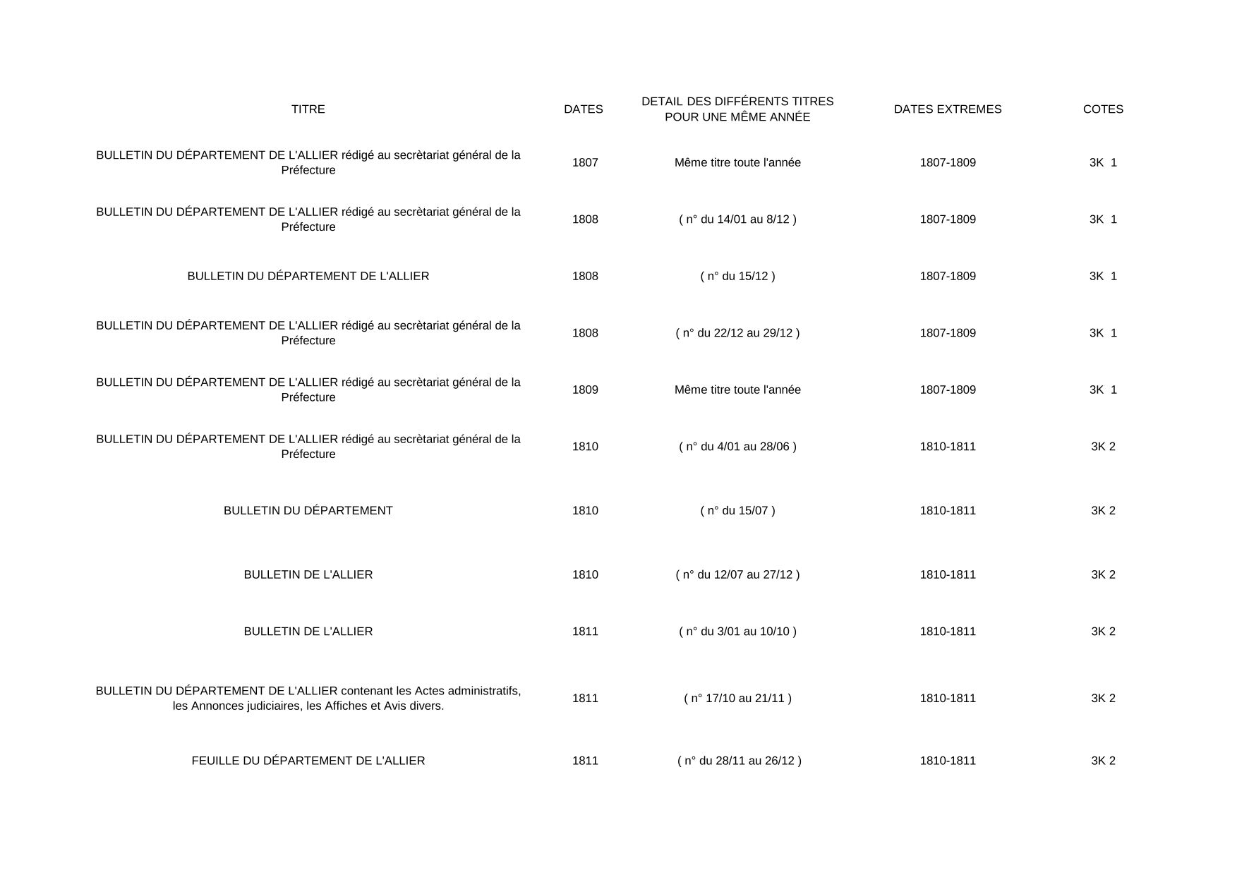 Inventaire en cours de la sous-série 3 K : Bulletin du département de l'Allier (1807-1815) puis Bulletin des actes de la préfecture (1815-1820) et enfin Recueil des actes administratifs (1820-2021 en cours).