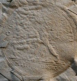 Description : Illisible. A senestre, un lion rampant qui semble s'attaquer à une masse importante. Inscriptions en pied et autour.