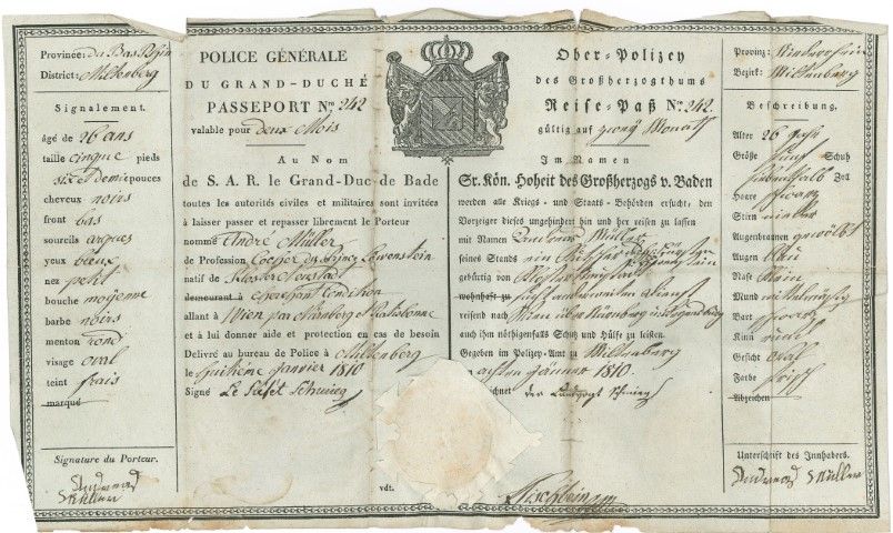 Analyse du document : Police générale du grand-duché de Bade, province du Bas-Rhin, district de Miltenberg. Passeport n°242 valable pour deux mois, pour André Müller, cocher du prince Löwenstein, natif de Kloster Neustadt, cherchant condition, allant à Vienne par Nuremberg et Ratisbonne (Miltenberg, 8 janvier 1810).