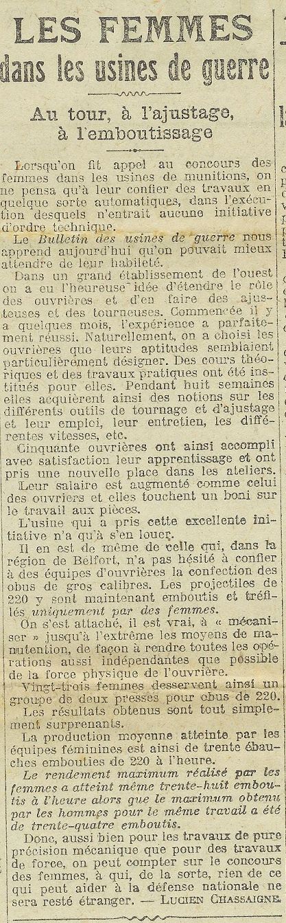 L’idée d’une guerre émancipatrice pour la condition féminine doit toutefois être nuancée. D’une part, les femmes sont nombreuses à travailler en France avant la guerre ; d’autre part, pendant le conflit, elles ont surtout occupé des fonctions de remplaçantes ou d’auxiliaires et n’ont pas acquis de postes de décision. Par ailleurs, en 1914, les femmes gagnent deux fois moins que les hommes, même si cet écart sera divisé par deux en 1917.