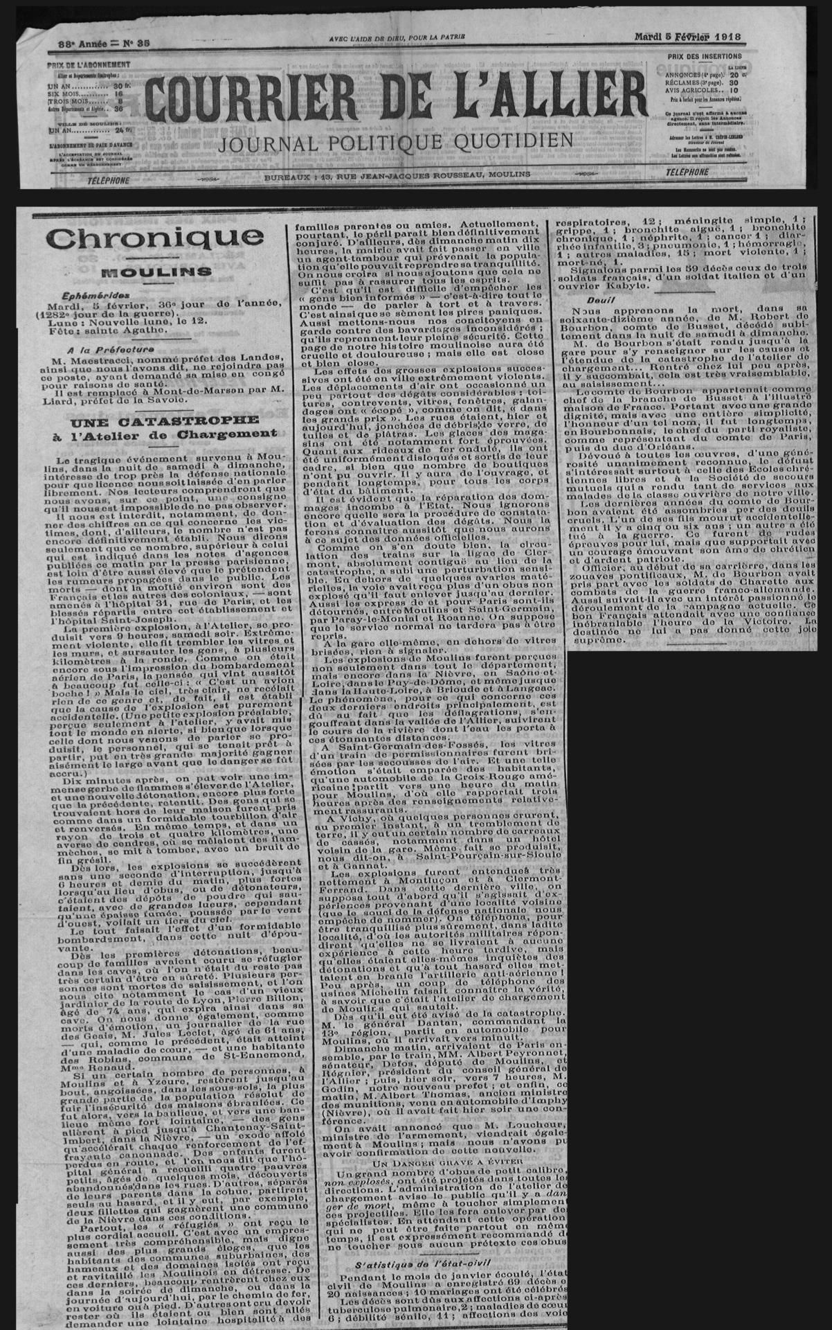 Dans la nuit du 2 au 3 février 1918, une série d’explosions d’origine accidentelle se produisent à l’atelier de chargement d’obus d’Yzeure. L’accident occasionne des dégâts matériels importants, et entraîne la mort de trente-deux personnes.