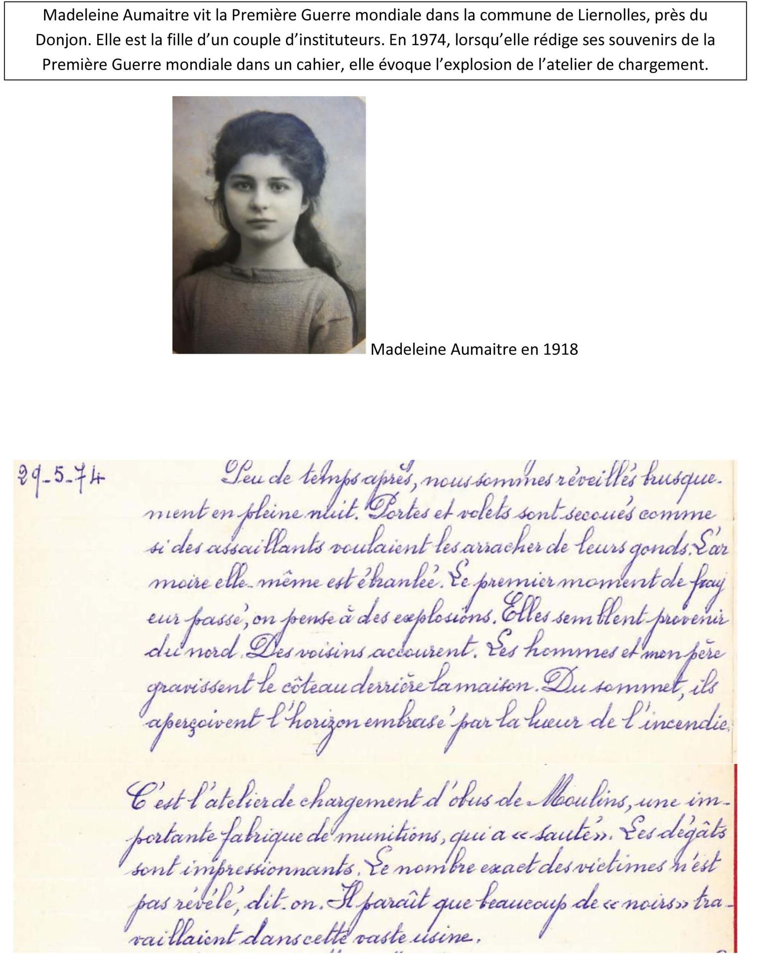 De nombreux contemporains ont relaté l’événement dans leurs écrits ou dans leur correspondance. Parmi eux, Madeleine Aumaître qui réside alors dans la commune de Liernolles, près du Donjon. Elle est la fille d’un couple d’instituteurs et passe son certificat d’études en cette année 1918. En 1974, lorsqu’elle rédige ses souvenirs de la Première Guerre mondiale dans un cahier, elle évoque l’explosion de l’atelier de chargement. Abel Grand porte un regard plus ironique sur cet événement.