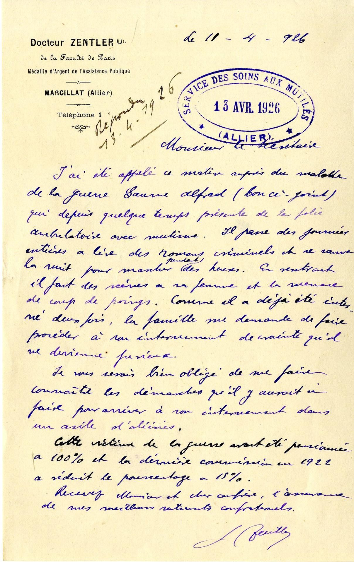 Le Dr Zentler de Marcillat s’adresse ainsi au secrétaire d’une association d’anciens combattants et victimes de guerre de la région de Vichy pour demander l’internement d’Alfred Saurne, un ancien soldat atteint de « folie ambulatoire avec mutisme ».