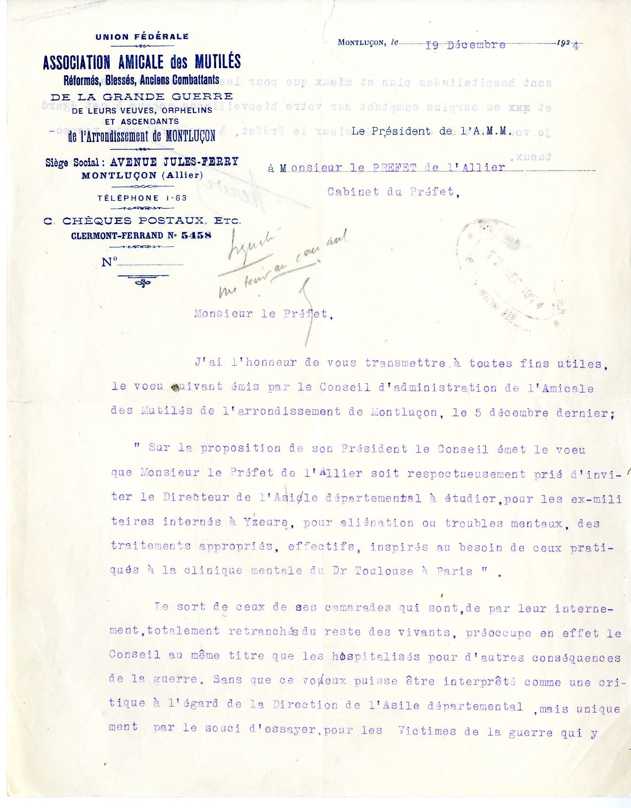 Le 19 décembre 1924, l’amicale des mutilés de l’arrondissement de Montluçon écrit au préfet afin de l’inviter