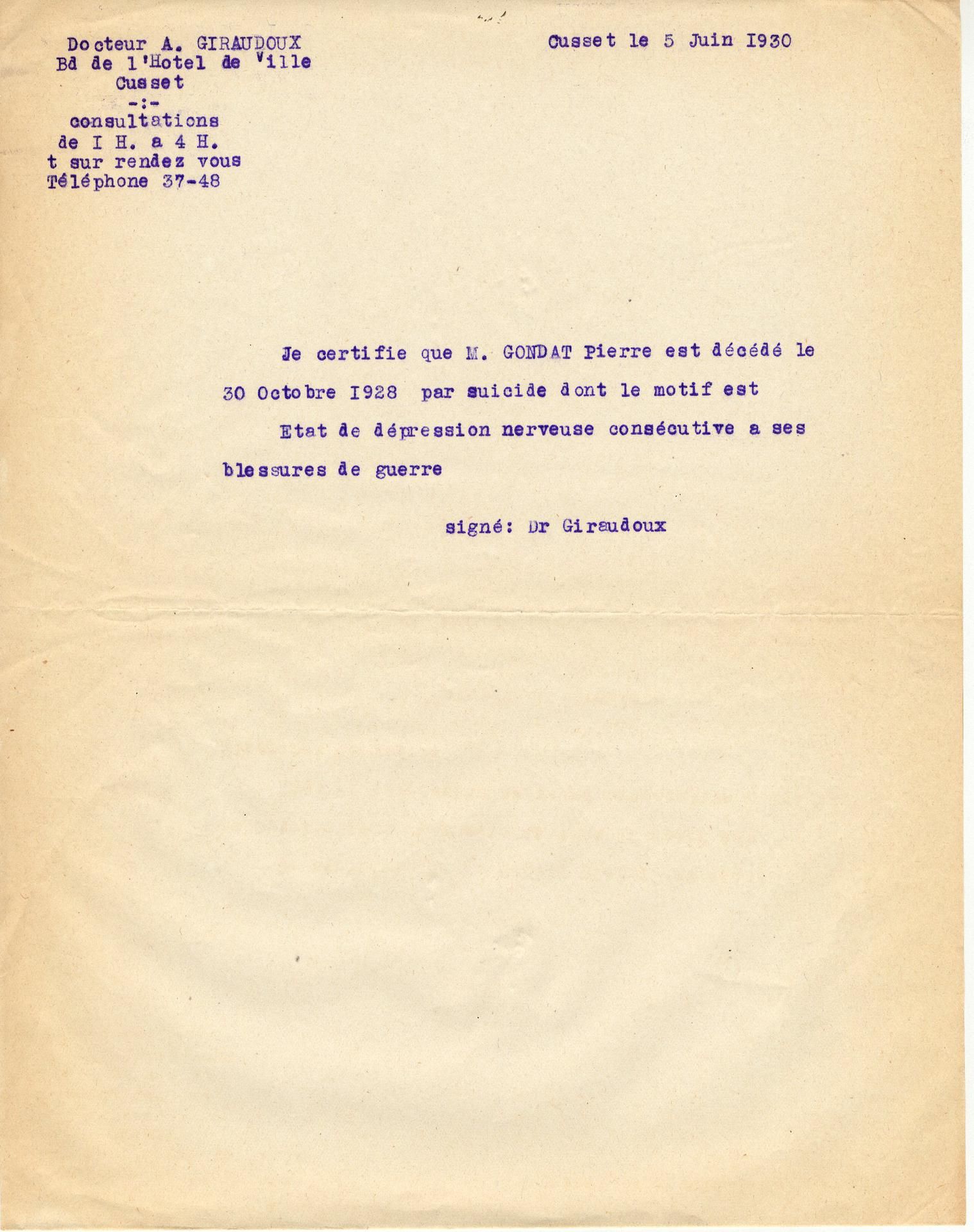 Malheureusement, l’amélioration de la prise en charge avec la loi de 1919 ne suffit pas à masquer le mal être de ces hommes psychiquement meurtris. Certains ne s’en relèvent pas comme P. Gondat. Sa veuve espère que l’imputabilité de sa mort à la guerre lui donnera droit à la pension.