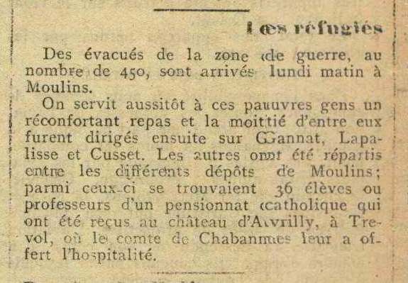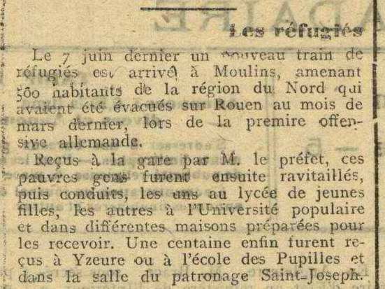 Le 3 juin 1918, accueil de « 450 évacués » en gare de Moulins signalé dans La Croix de l’Allier, 9 juin 1918. La moitié d’entre eux dirigé vers Gannat, Lapalisse et Cusset, les autres dans la région de Moulins dont 36 élèves et professeurs d’un pensionnat catholique accueillis au château d’Avrilly à Trevol par le comte de Chabanne. Le 7 juin, ce sont "500 habitants de la région du Nord" qui sont accueillis en gare par le préfet de l'Allier. Voir les articles ci-dessous du journal La Croix de l'Allier.