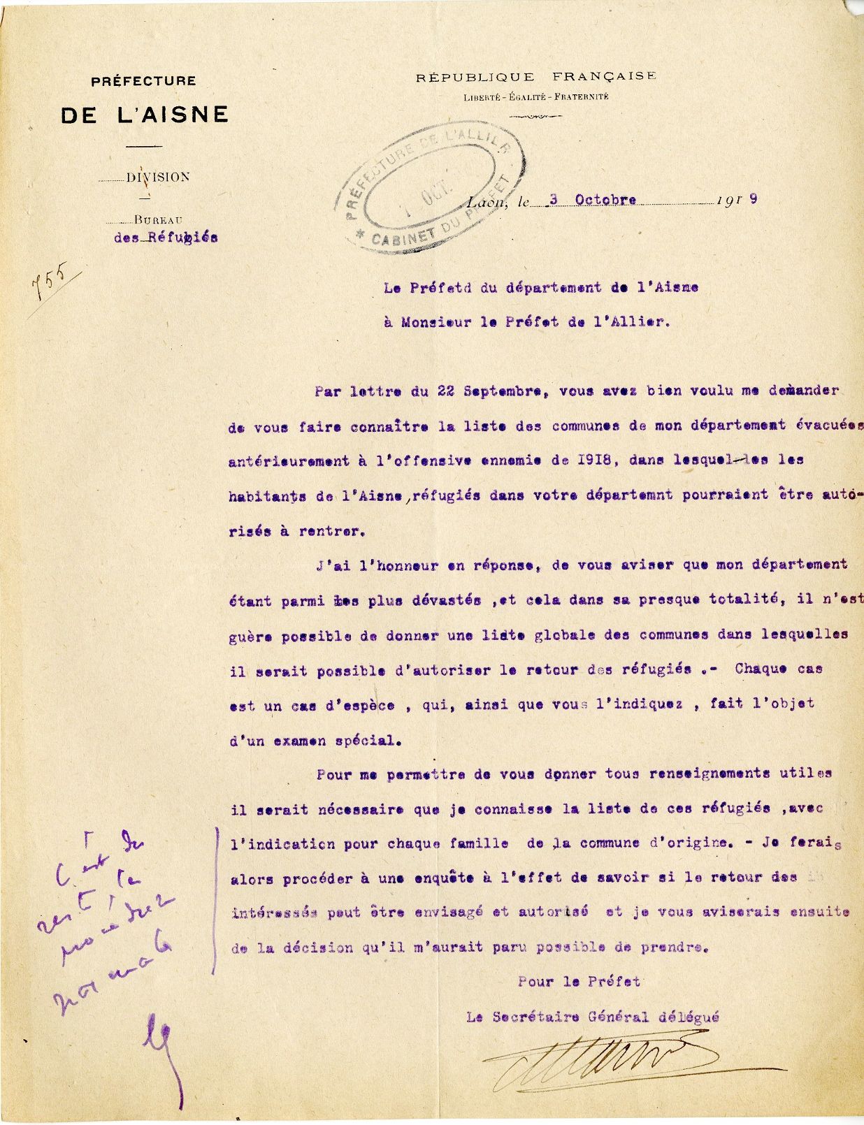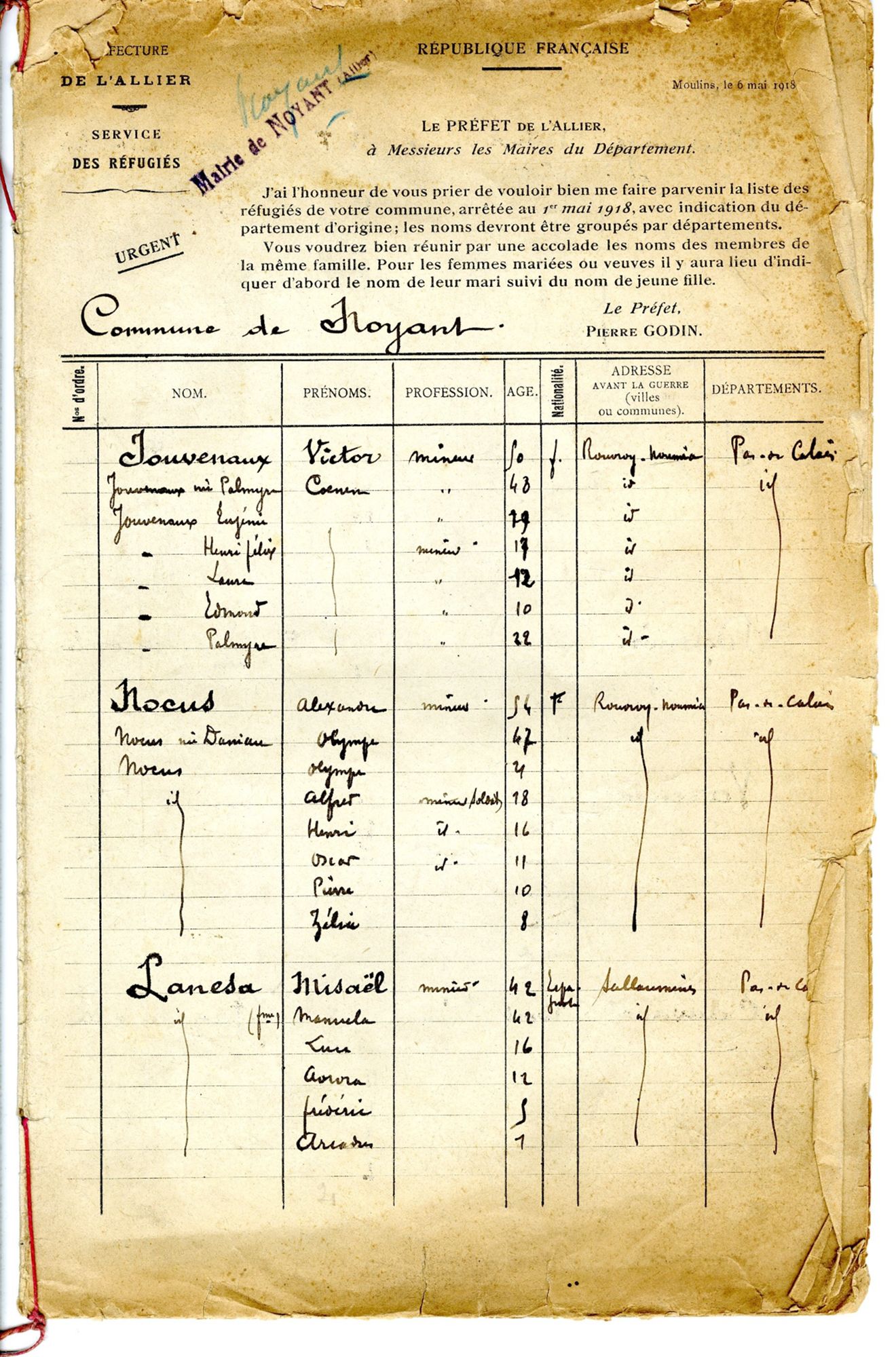 En 1919, le préfet de l'Allier demande aux maires du département de lui fournir le nombre des réfugiés accueillis dans leur commune. Voici ci-dessous, quelques exemples par arrondissement.