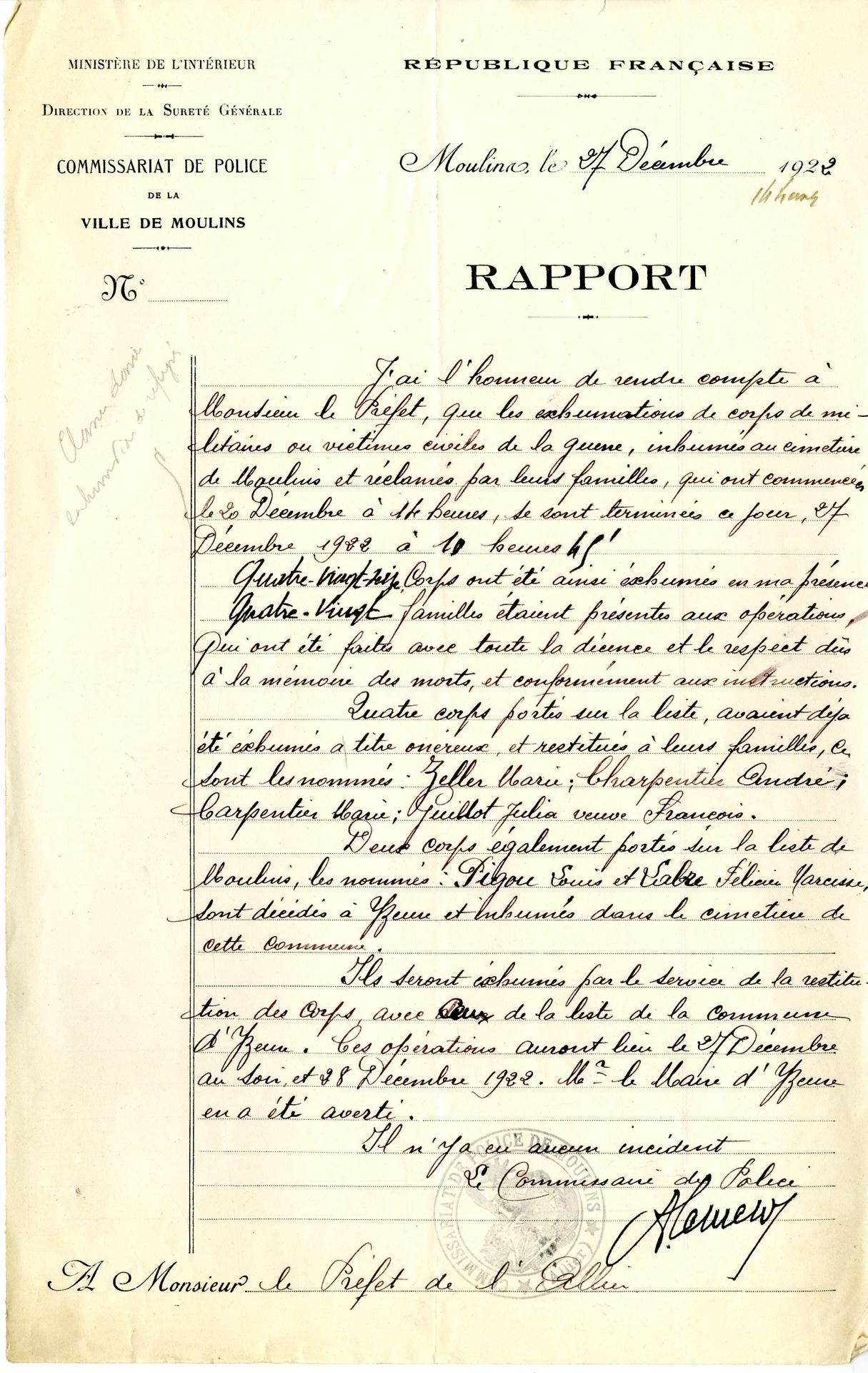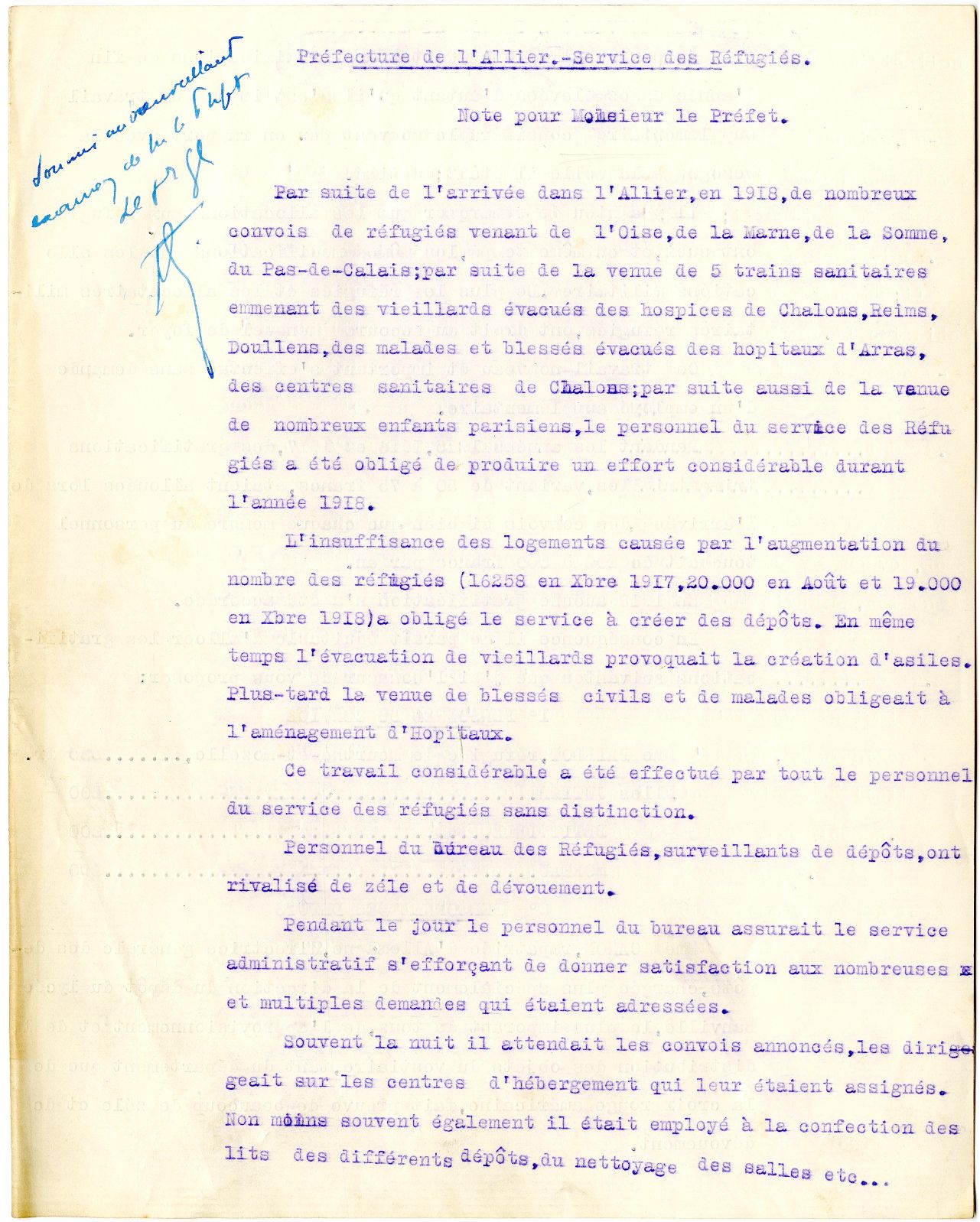 Ainsi le sous-préfet de Gannat propose au préfet de récompenser Octave Barthoux, fonctionnaire travaillant sous ses ordres, qui « s’est occupé activement du service des Réfugiés » notamment pour les questions de leur placement dans les communes et Léopold Van Severen, réfugié belge ayant fait office d’interprète « auxiliaire précieux »