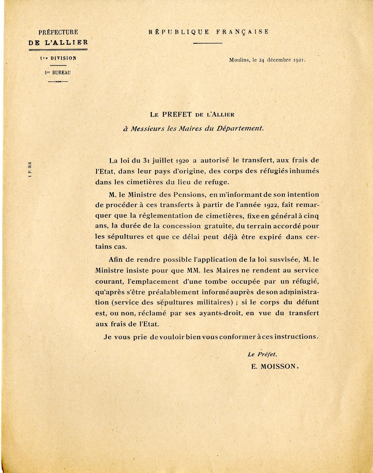 Sources : Archives départementales de l’Allier, dossiers de la préfecture relatifs à l’accueil des réfugiés (cote : 8 R 9 et 16)