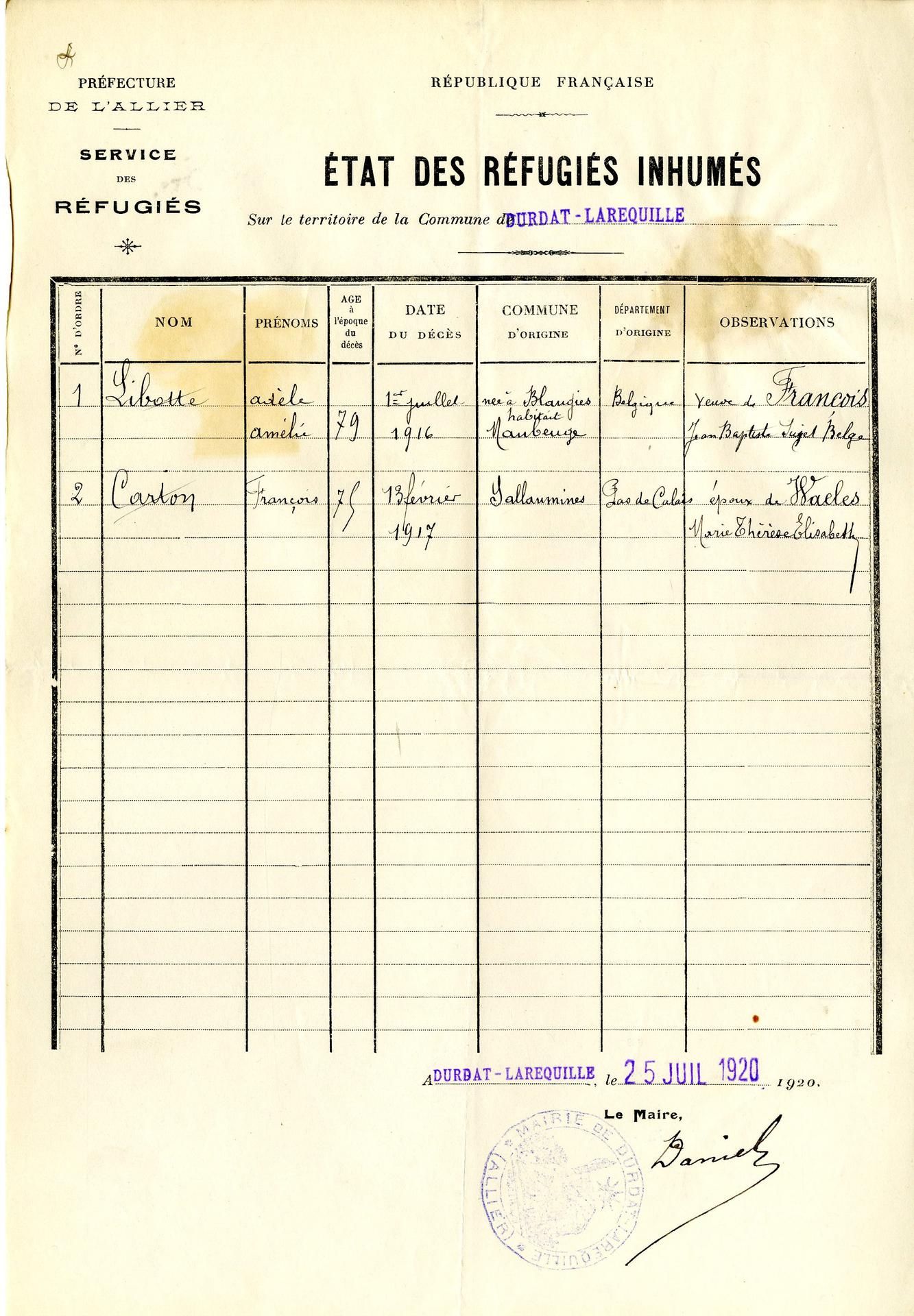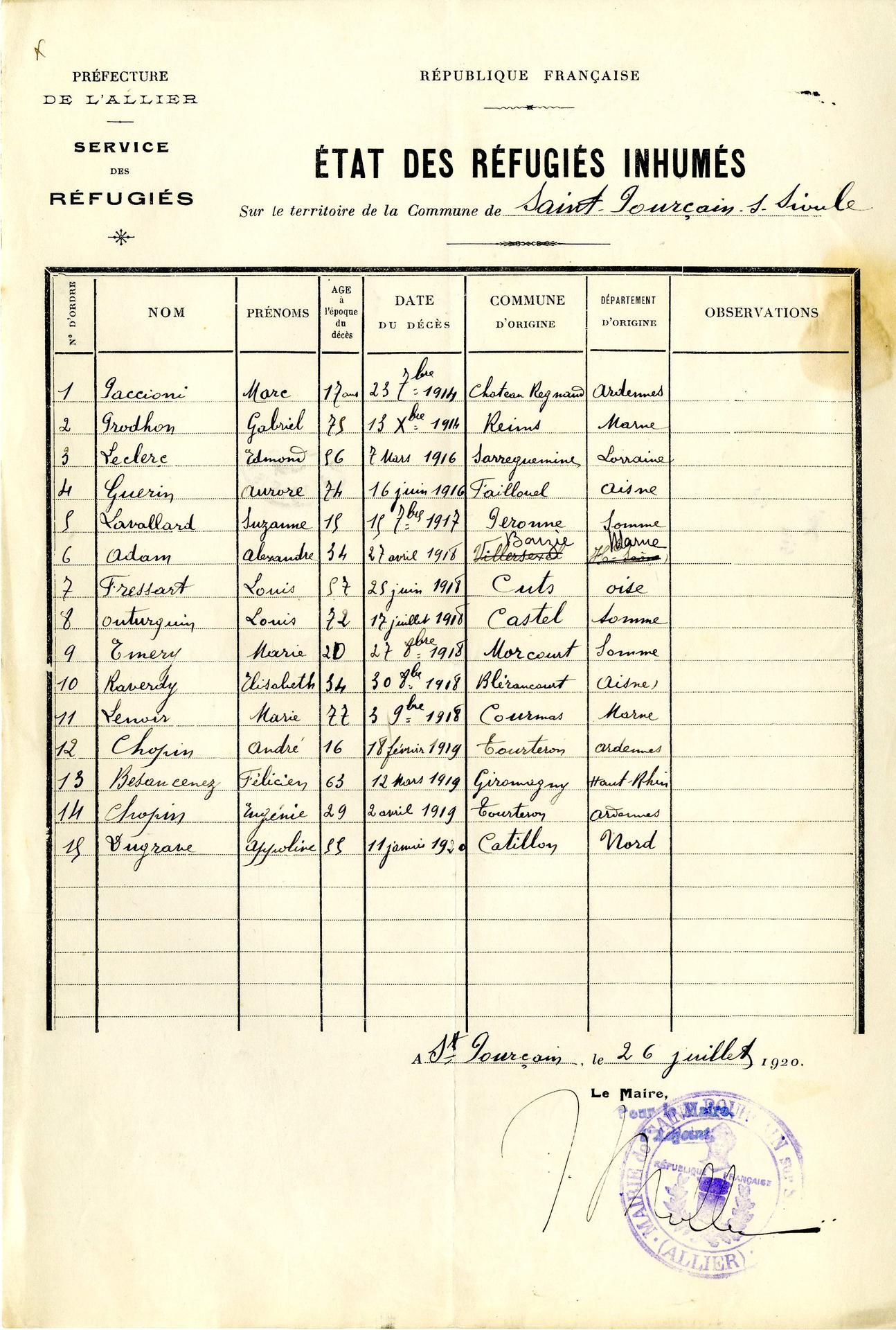 [2] 16258 réfugiés en décembre 1917, 20000 en août 1918 puis 19000 en décembre 1918. En 1916, ils représentent 2% de la population sur l’arrondissement de Moulins. En 1919, ils sont encore 1800 réfugiés sur cet arrondissement.