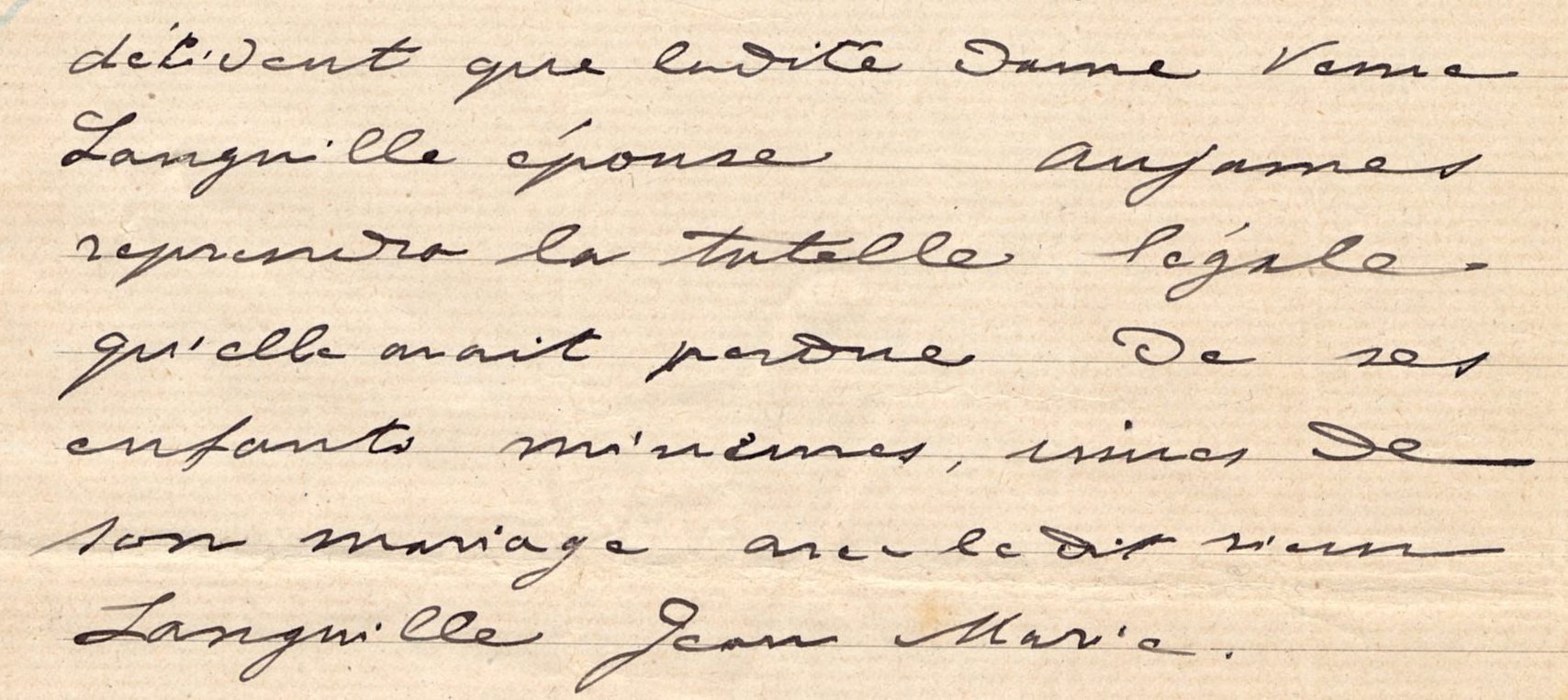 Catherine Laîné, de Lusigny, fait partie des 700 000[1] veuves de guerre après le premier conflit mondial. Veuve en premières noces de Jean-Marie Languille, elle s’est remariée avec Jean-Baptiste Aujames le 25 novembre 1919. Ce remariage lui fait perdre la tutelle de droit de ses enfants mineurs. Suite au décès de leur mari, les veuves se voient confier la plupart du temps la tutelle de leurs enfants. Toutefois, elles doivent demander la réunion du conseil de famille afin qu'il les investisse officiellement dans cette fonction. Catherine Laîné assure avoir ignoré cette obligation. [2] Le 22 mai 1920, le conseil de famille, composé notamment de membres de la famille de son 1er mari, est réuni devant le juge de paix. Il confirme cette tutelle, et désigne son second mari co-tuteur.