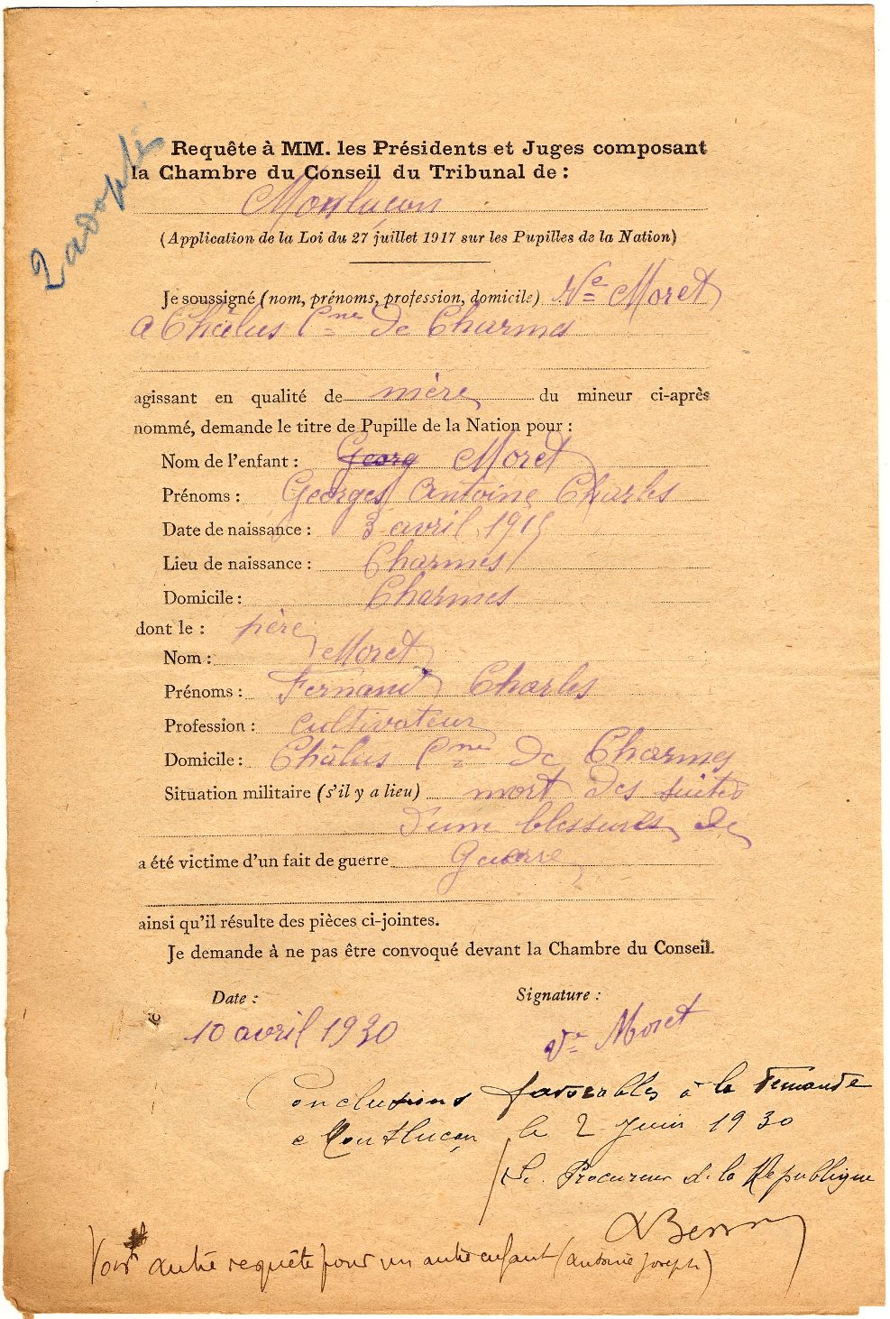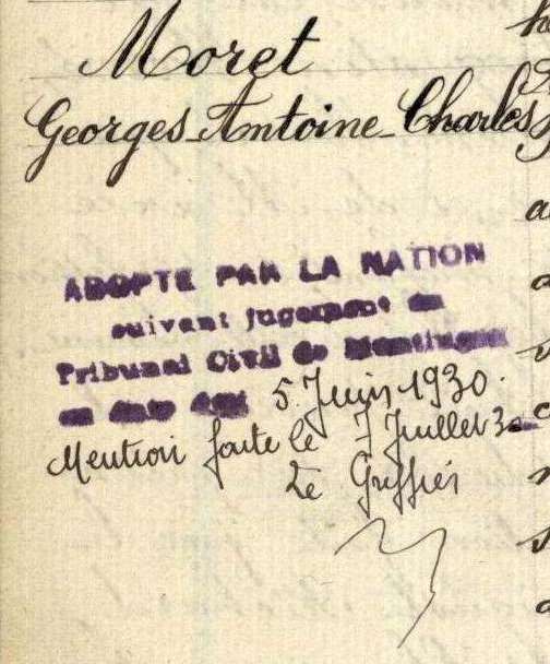 Mathilde Lucie Moret, habitante de Charmes, obtienten 1930 l'adoption par la Nation de ses deux fils après la mort de son mari. L'acte de naissance de son cadet porte d'ailleurs le tampon "adopté par la nation".