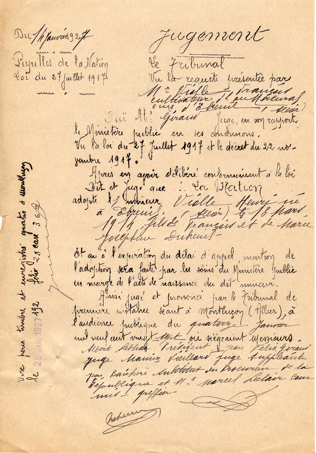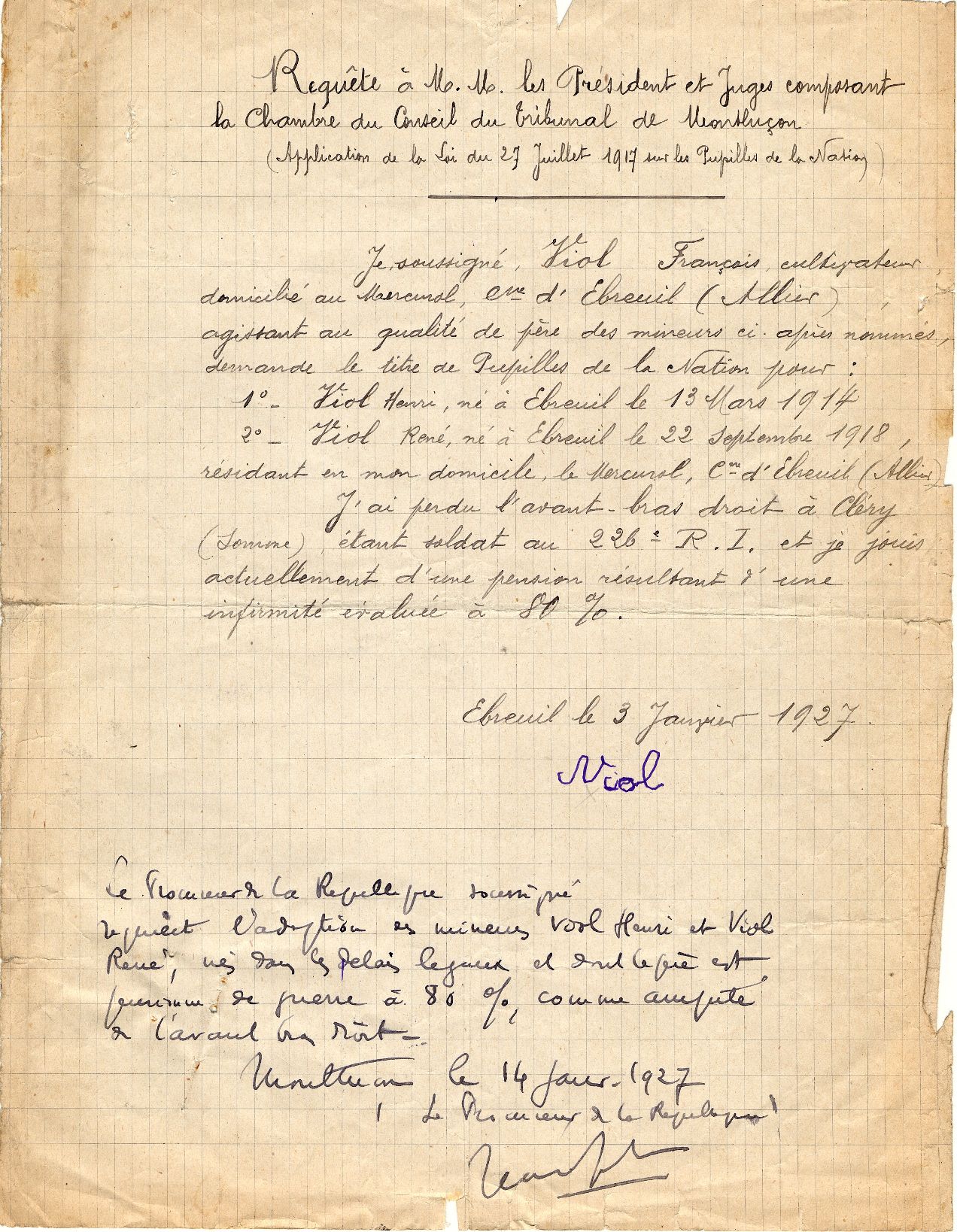Parfois les enfants sont adoptés par la Nation sans pour autant être orphelins. ainsi, René Viol, d'Ebreuil, mutilé de guerre fait une demande au tribunal de Montluçon pour ses deux fils. Elle est acceptée en 1927.