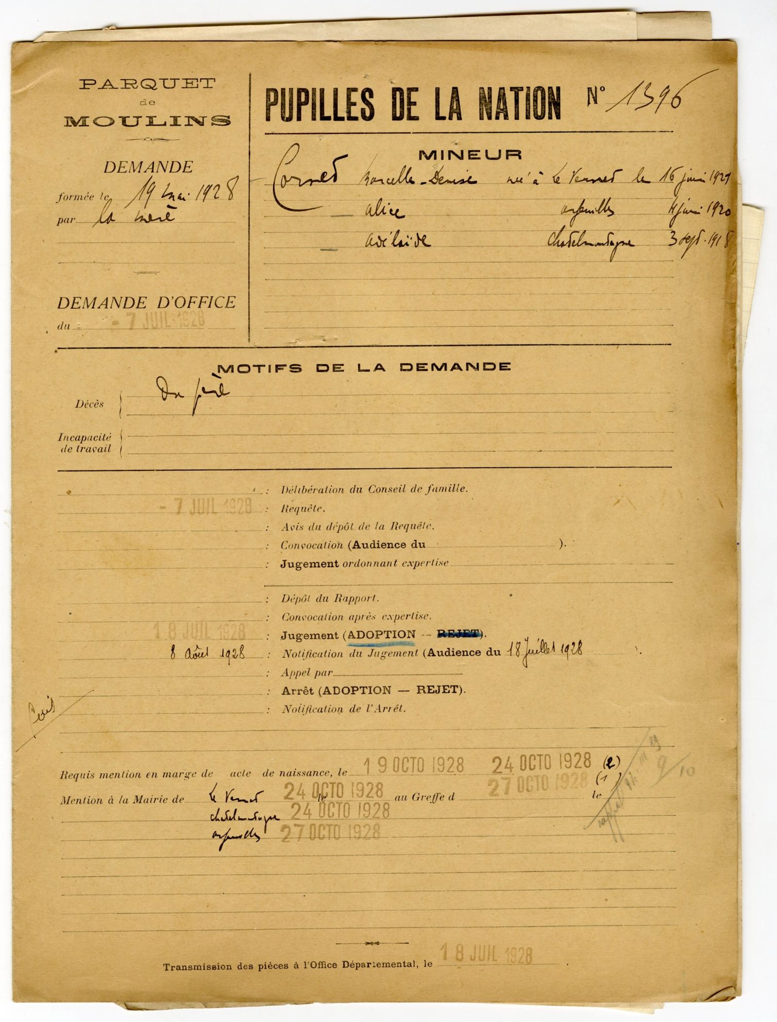 Le 23 août 1919, le tribunal civil de Montluçon prononce le jugement d’adoption par la Nation des 3 enfants de Marie-Joséphine Desforges et Charles Héraudet, originaire de Cosne-d’Allier, tué le 10 mai 1917.