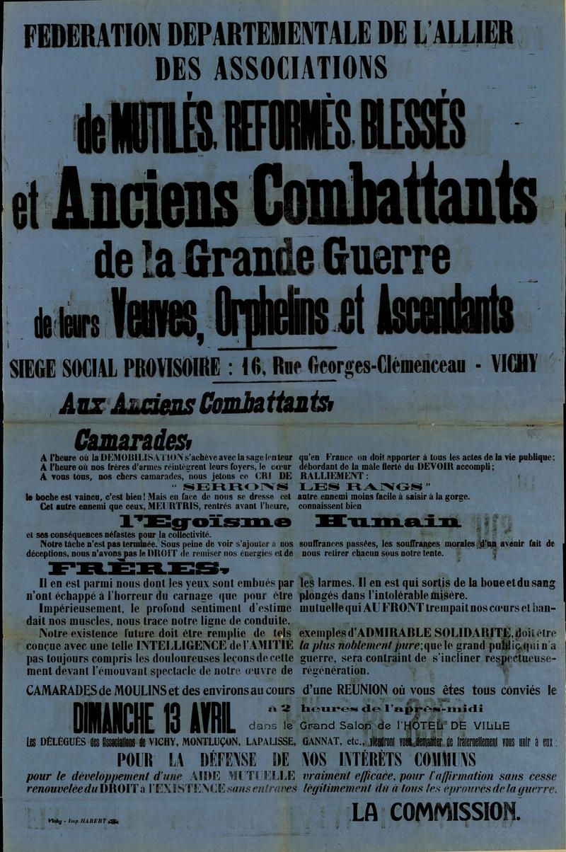 Exemples d'actions de l'association générale des mutilés de guerre dans l'Allier