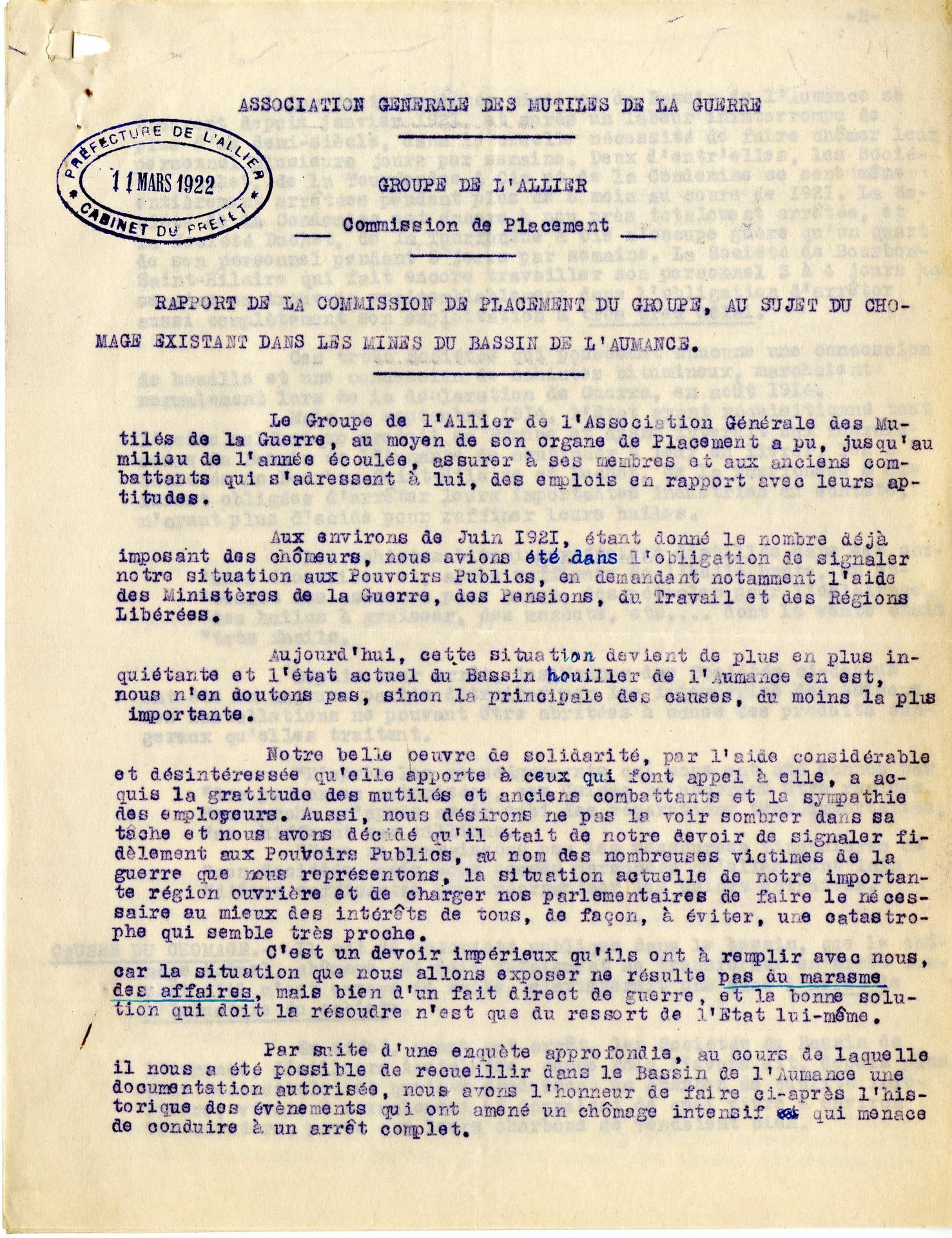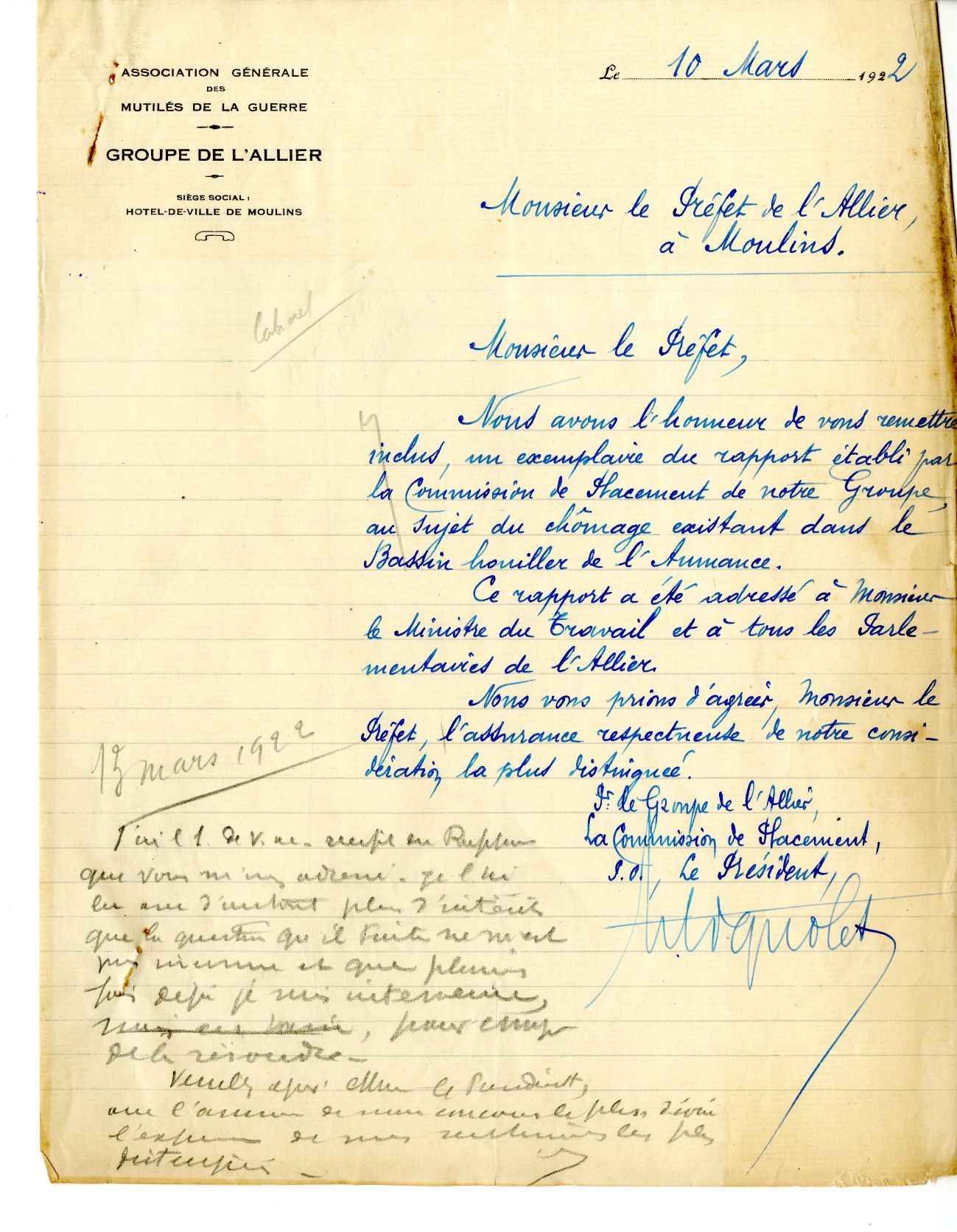 L'association générale des mutilés de la guerre (AGMG) se soucie du chômage dans le bassin minier de l’Aumance (voir son rapport du 10/03/1922). Elle oeuvre à la protection des veuves et ascendants en luttant contre les expulsions locatives (voir courrier ci-dessous du 22/10/1923).
