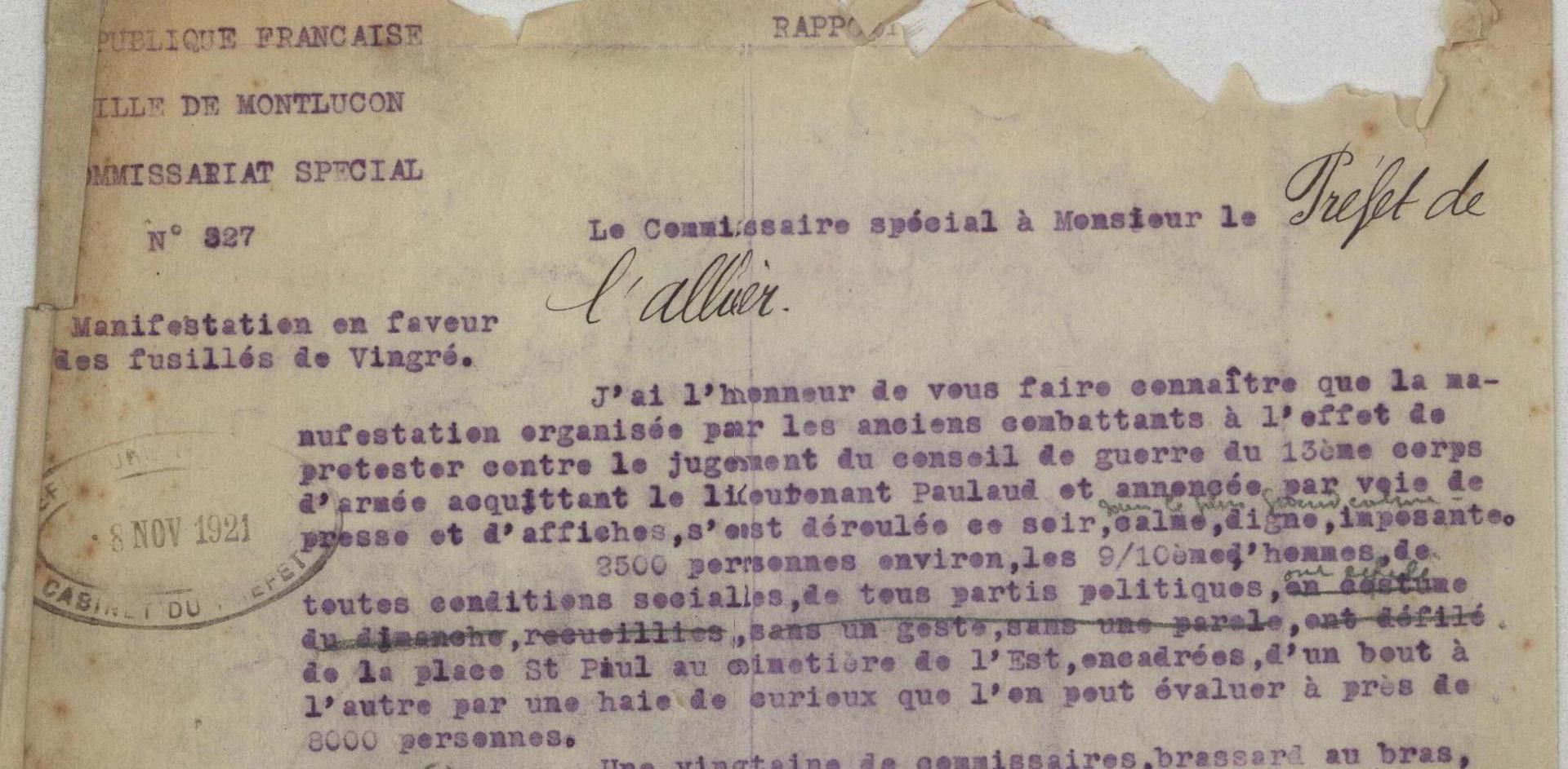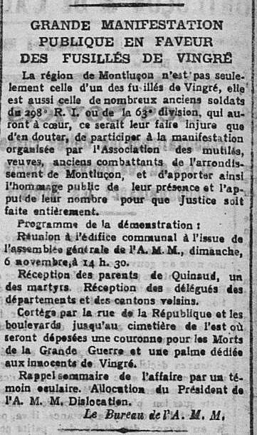 Après leur réhabilitation par la Cour de Cassation le 18 février 1921, les anciens combattants de l’Allier veulent que la justice aille jusqu’au bout. C’est le sens de la manifestation à Montluçon du 6 novembre 1921 :
