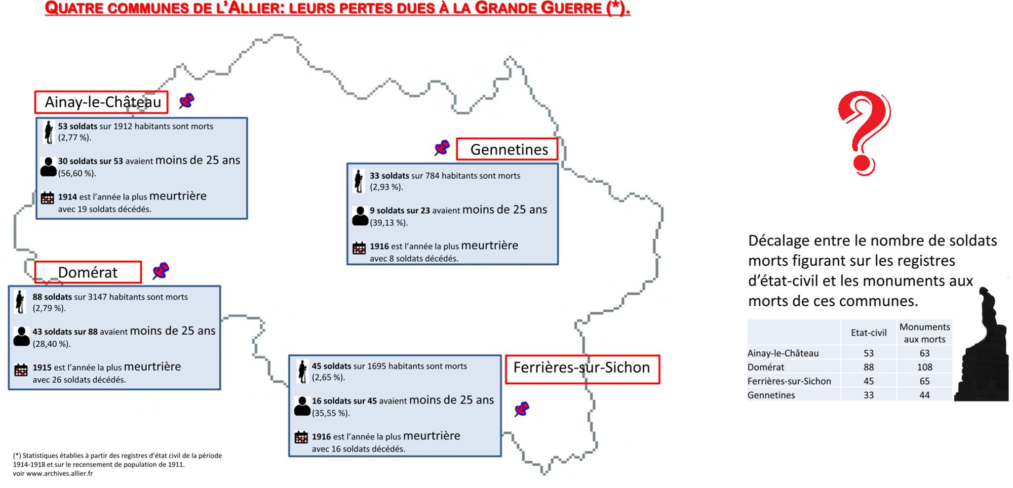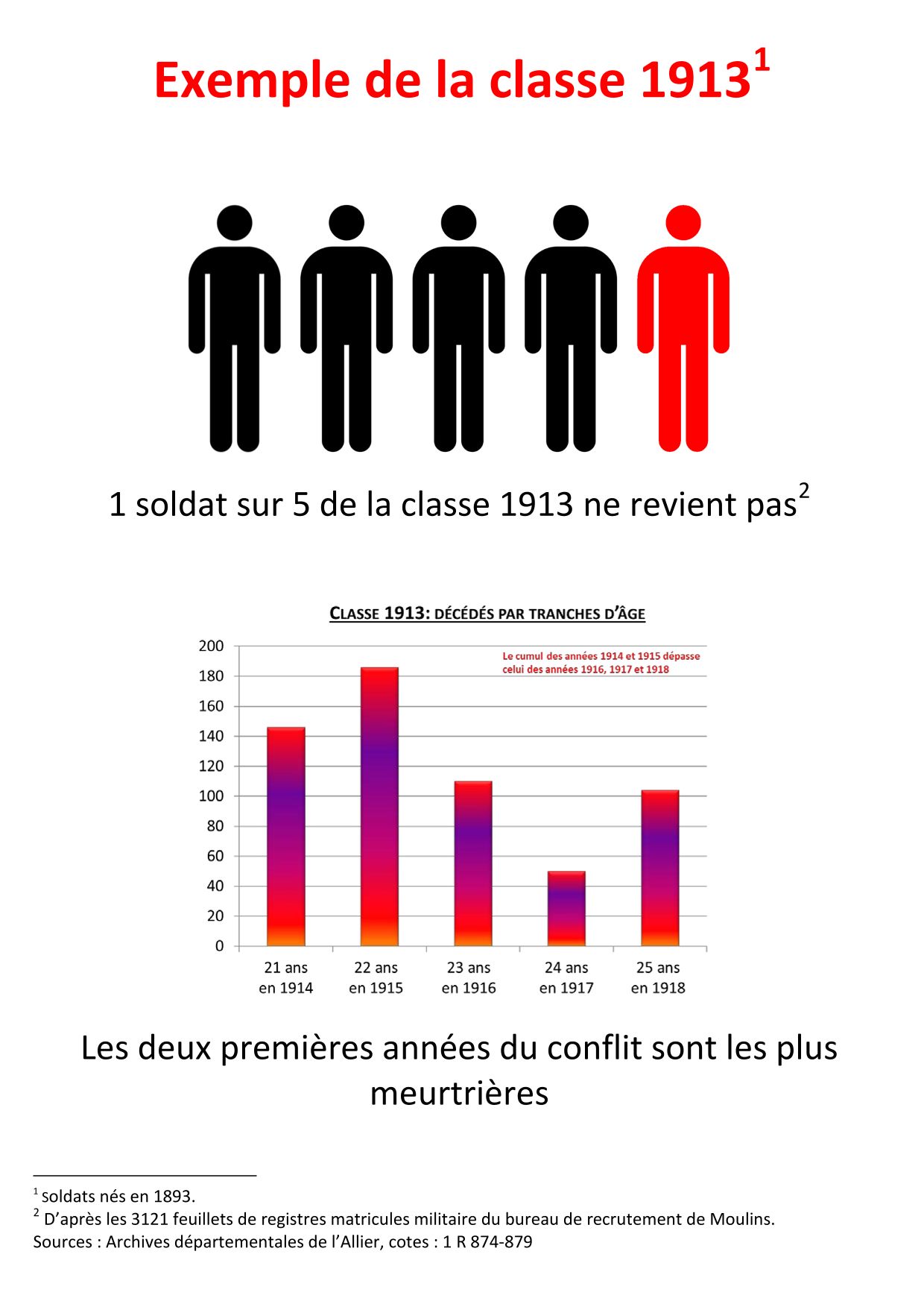 Dans l’Allier, 15315 morts[3] sont décomptés. Pour la classe 1913, 1 mobilisé est 5 tué.
