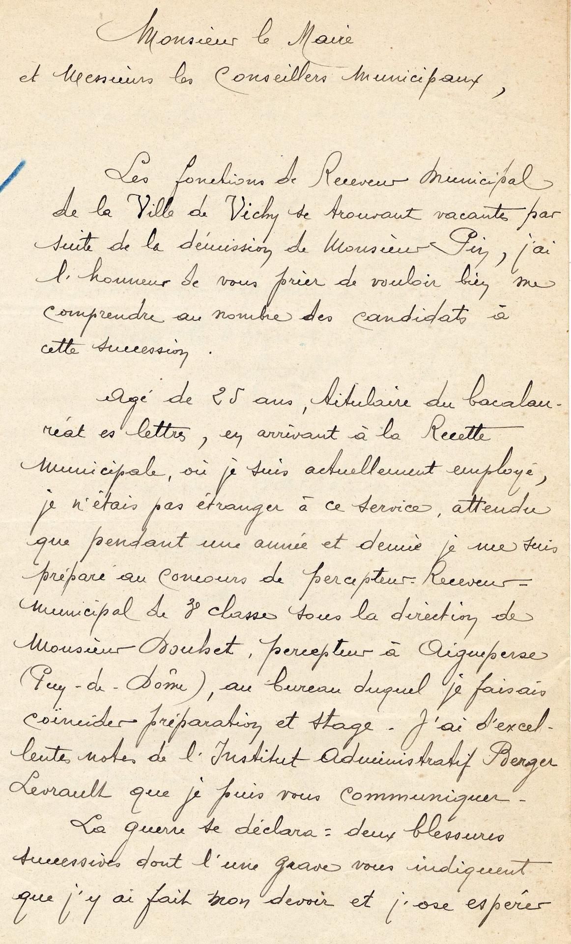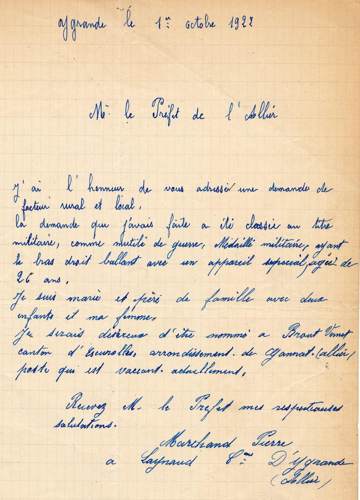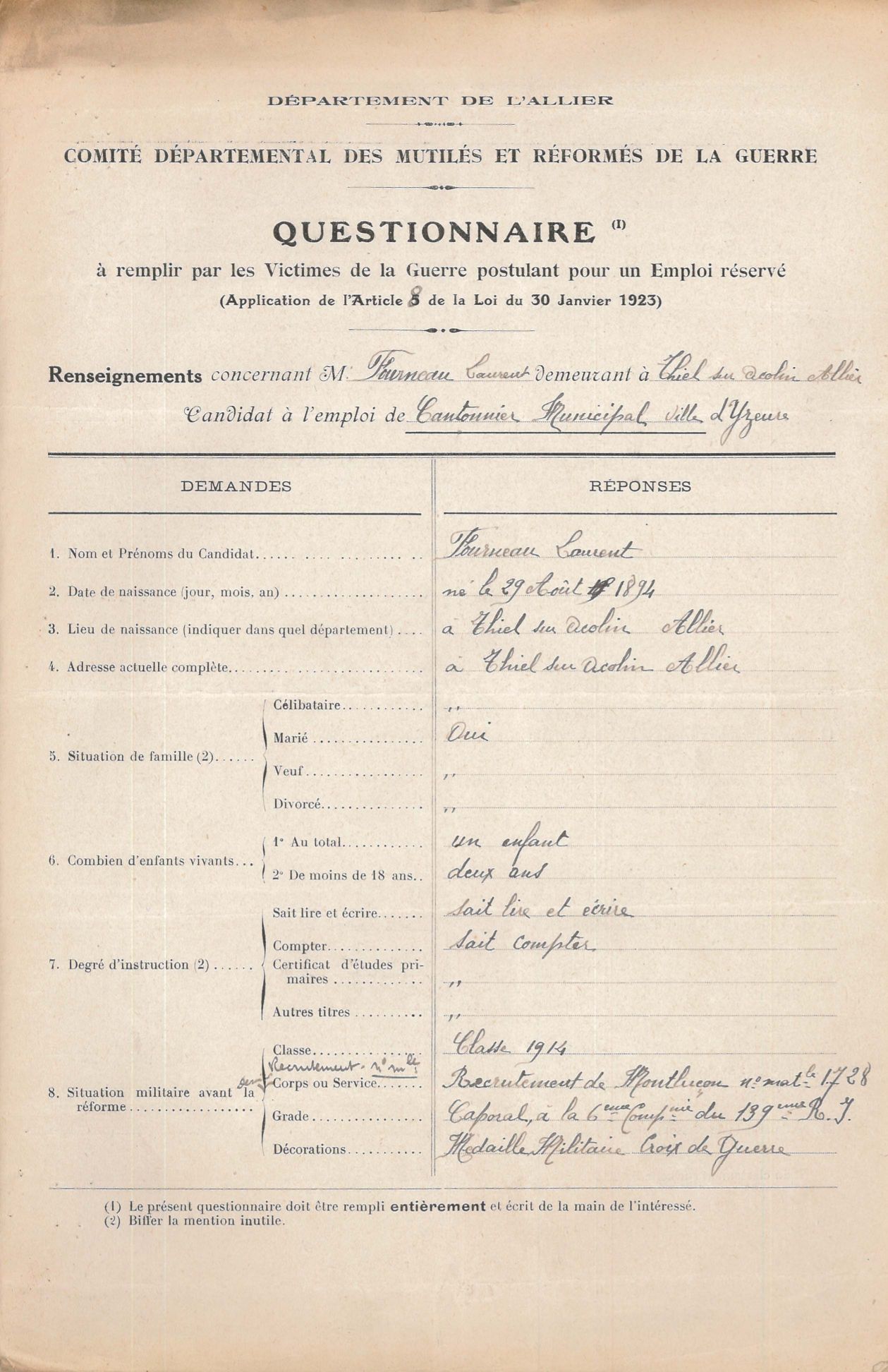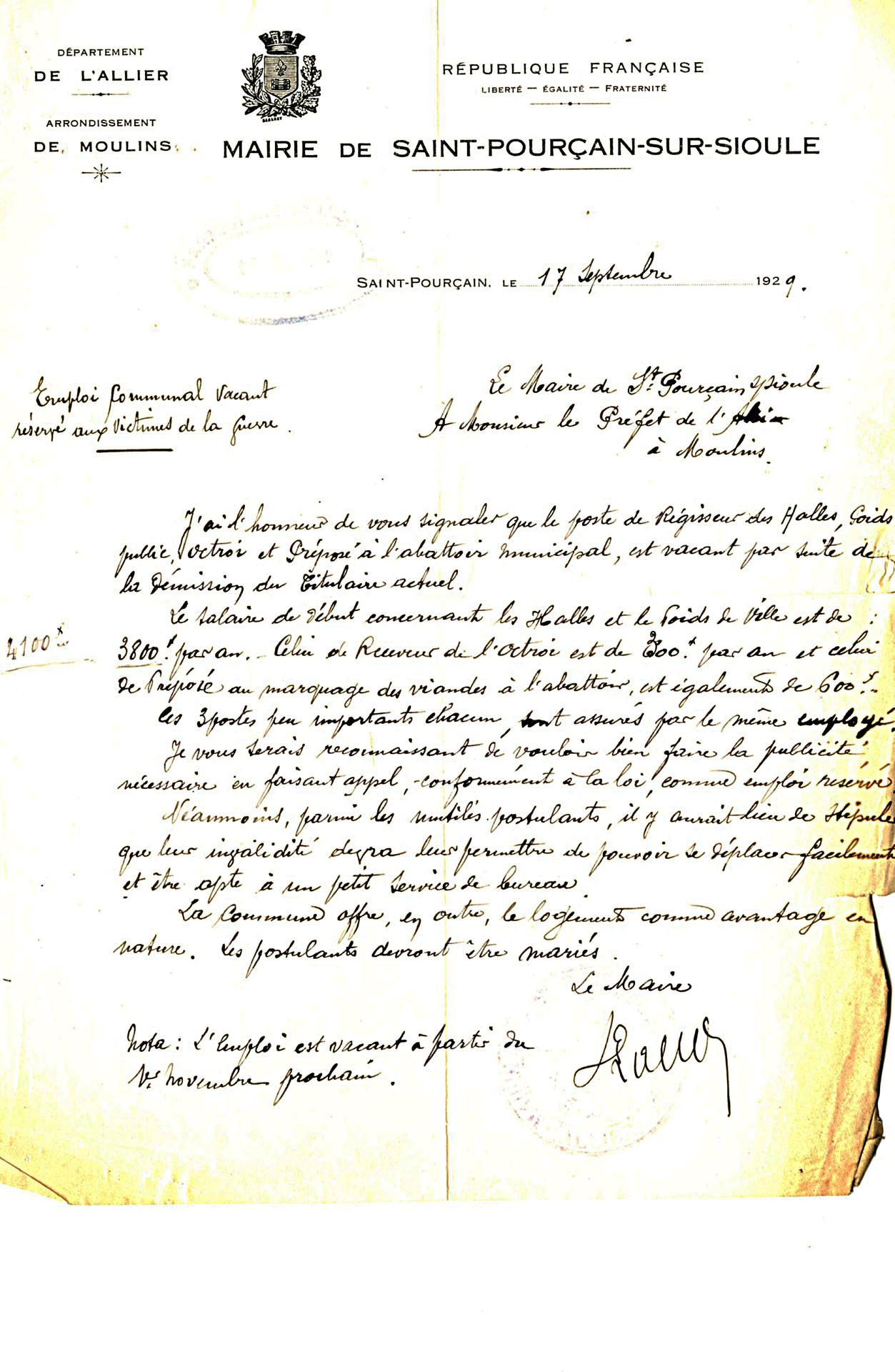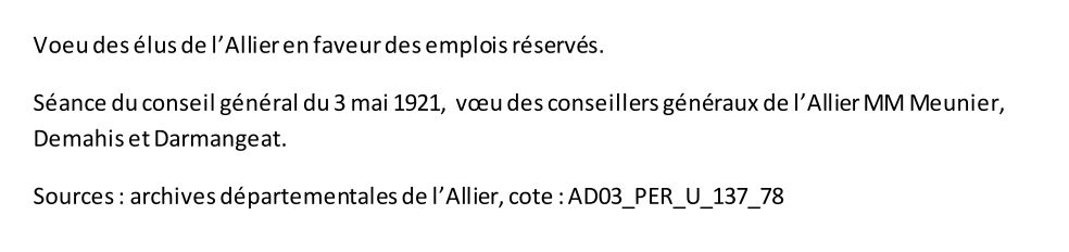 Les conseillers généraux de l’Allier Boudet, Meunier, Demahis et Darmangeat demandent que des emplois soient réservés pour les mutilés et veuves de guerre.