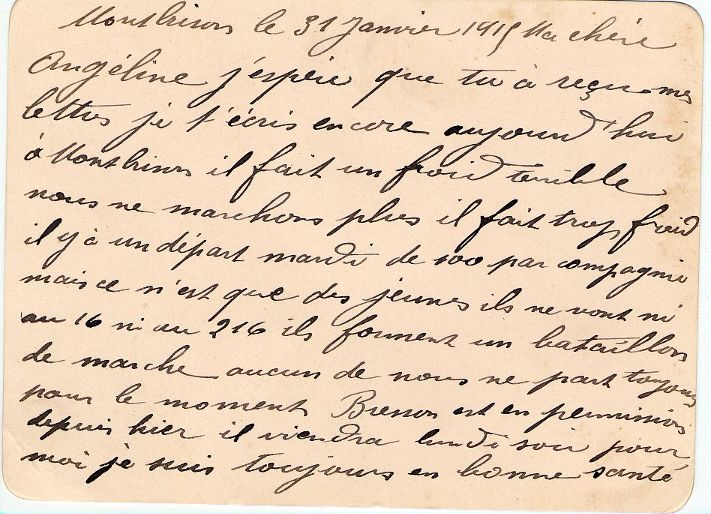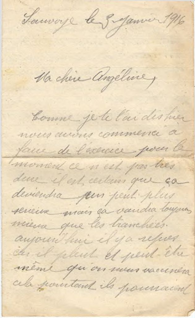 Durant toute la durée du conflit, elle échange de nombreuses lettres avec son mari, mobilisé en août 1914, puis envoyé au front en mars 1915. Il n’en reste malheureusement que 3 (voir lettres) : il est fréquent de ne pas retrouver la correspondance des femmes, leurs époux ne pouvaient conserver les lettres très longtemps au front. ANgéline évoque surtout les affaires quotidiennes qui l’occupent, notamment la réalisation des travaux agricoles qui lui incombent, aidée en cela par son beau-père et par les autres membres de la famille non mobilisés ; elle décrit aussi les difficultés du quotidien à l’arrière. Elle relate également à son mari la situation militaire en France, puisque ce dernier se trouve sur le front oriental, dans la presqu’île de Gallipoli. Elle fait écho aux préoccupations de son mari (une guerre jugée souvent trop longue) et met en rapport les faits mentionnés dans les journaux avec ceux que peut vivre son mari.