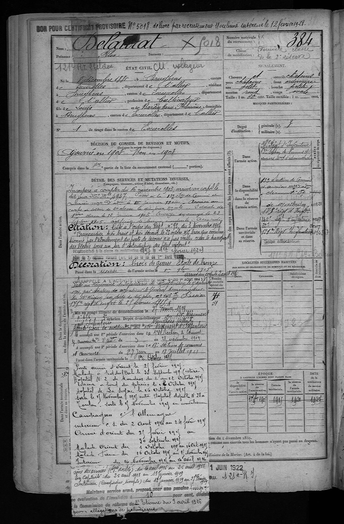 Félix Delaurat exerçait la profession de cultivateur, au lieu-dit les Biscards dans la commune de Brugheas, dans le canton d’Escurolles. Il est mobilisé en août 1914 à l’âge de 33 ans (voir registre marticule).