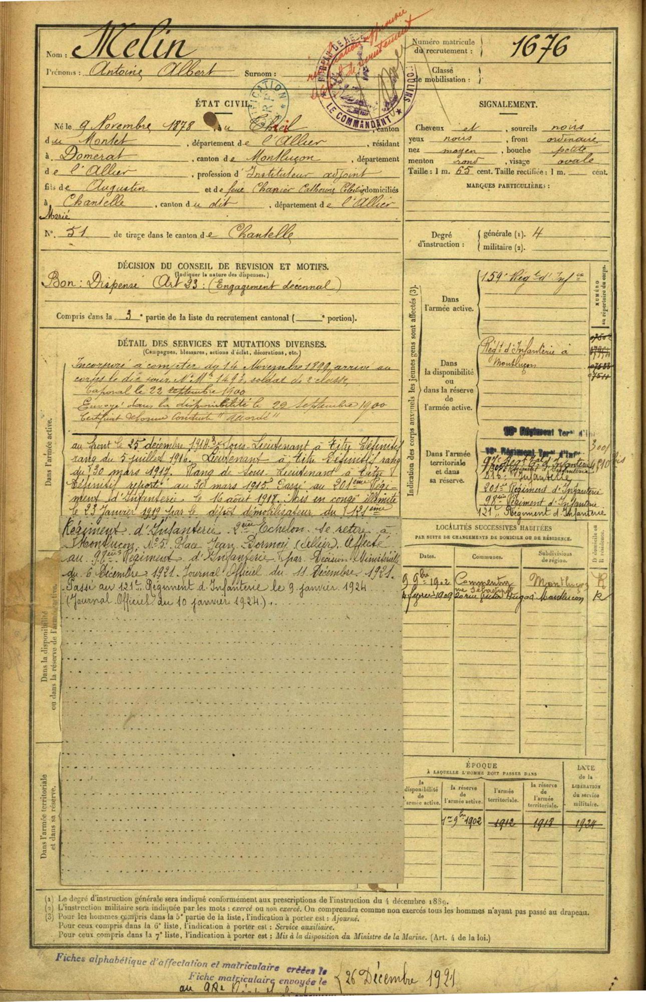 Albert Melin (voir photo) est né le 9 novembre 1878 à Chantelle dans l’Allier. Il est le fils d’Augustin et de Célestine Melin, agriculteurs. Devenu instituteur titulaire en 1902, il enseigne d’abord à Commentry, puis est nommé à Montluçon à titre définitif en 1908.