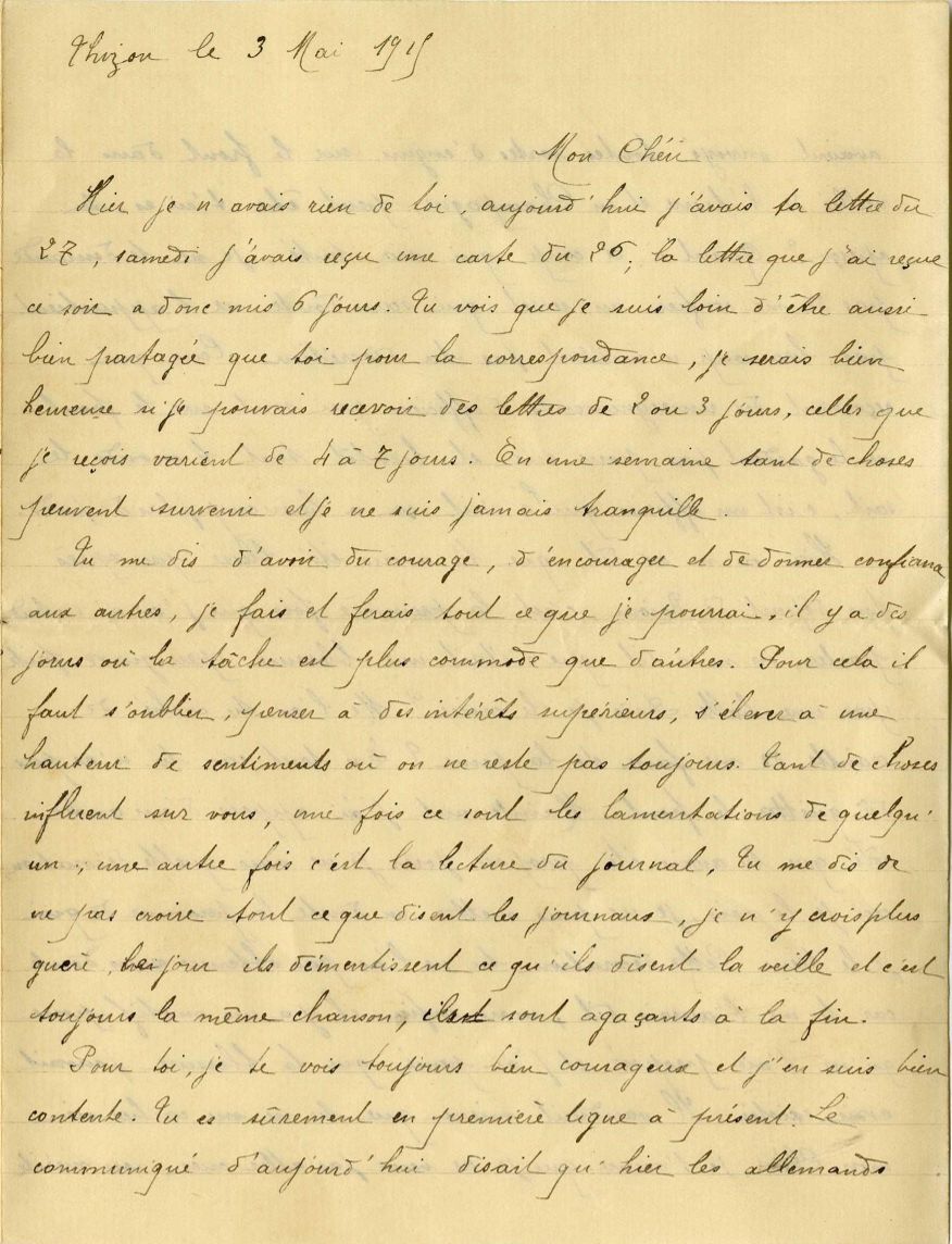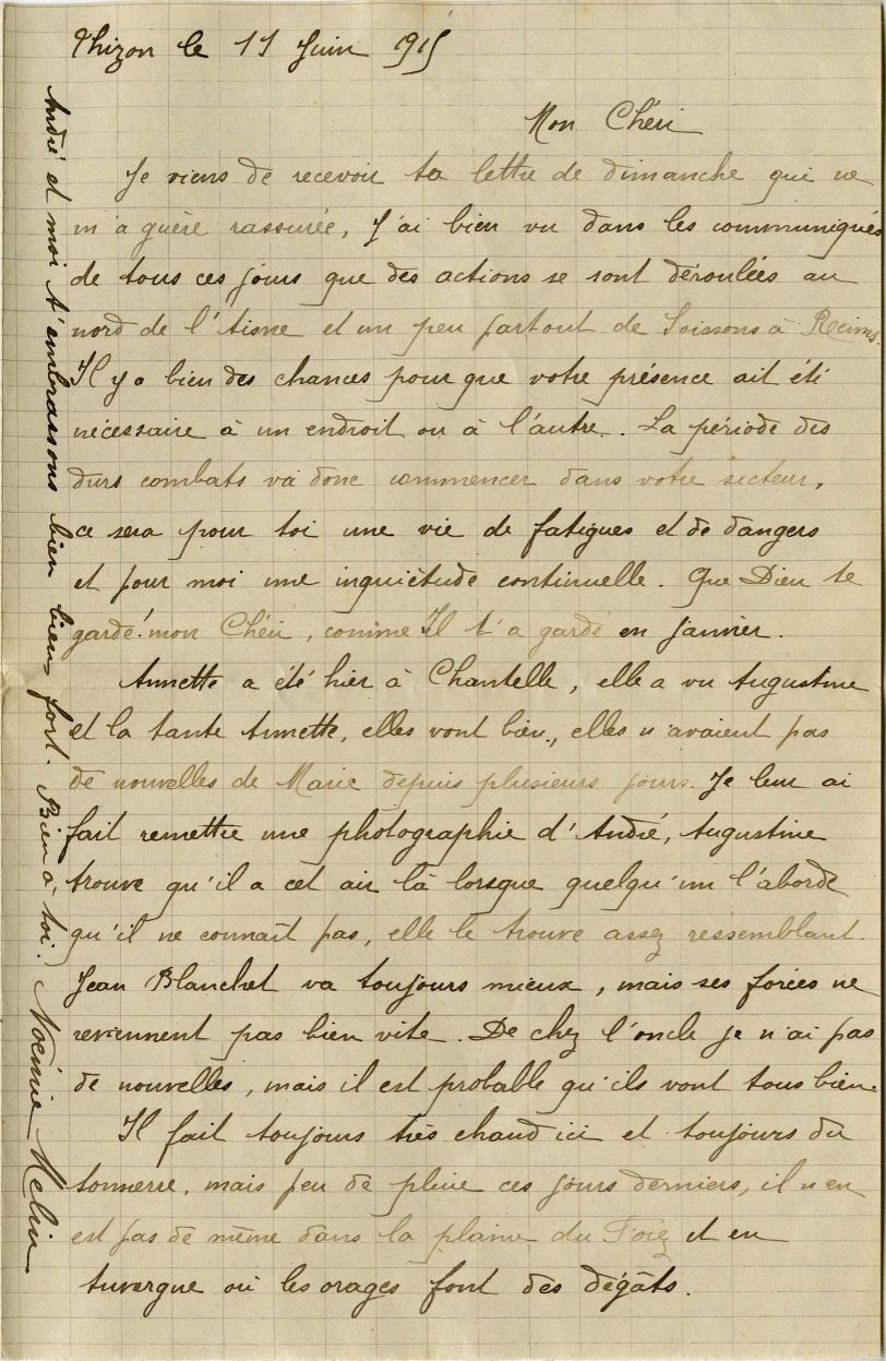 Noémie Melin n’exerce pas de profession particulière. Avec la guerre, elle quitte Montluçon pour s’installer à Thizon, près de Fourilles. Ses lettres témoignent de la représentation du conflit à l’arrière, de la manière dont les populations civiles sont mobilisées et contribuent elles aussi à la guerre totale. Ses écrits montrent également l’évolution de l’opinion face à la durée de la guerre ou la représentation des ennemis, parfois dépeints comme des « maudits boches » (voir lettre du 19 janvier 1915). Si les informations fournies par les journaux sont parfois mises en doute (voir lettre du 3 mai 1915), Noémie ne remet jamais en cause les dirigeants politiques ou militaires et le bien-fondé de la guerre. Elle décrit également avec minutie les premiers pas et les moindres faits et gestes du petit André qui grandit loin de son père pendant ces longues années de guerre (voir fin de la lettre du 11 juin 1915).
